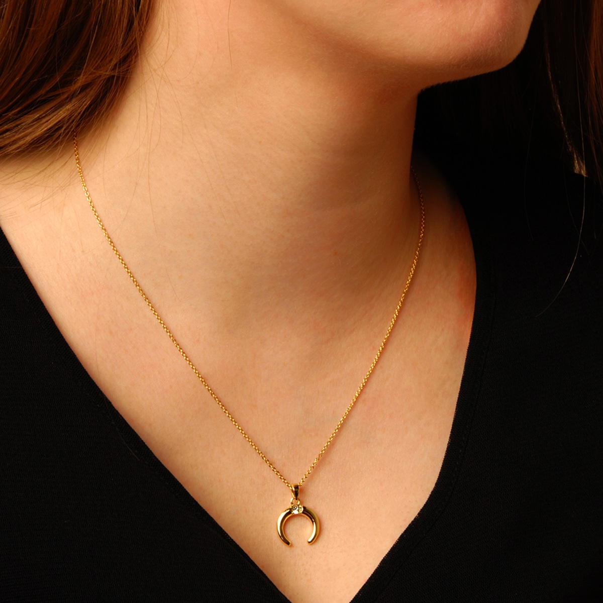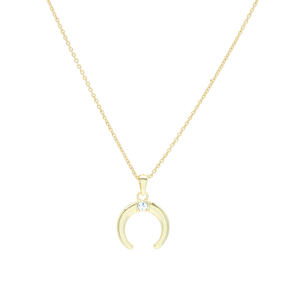 This modern and minimalistic "Beautiful Crescent" neckpiece boasts a sleek half-crescent design studded with a shimmering Swarovski crystal for easy-to-wear style. 18" designer chain with 2" extension. Nickel and lead free jewellery.