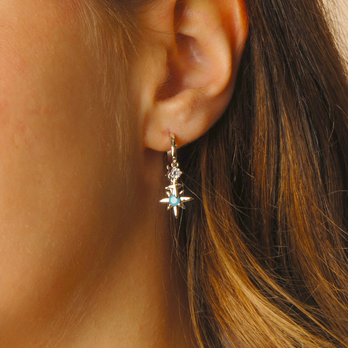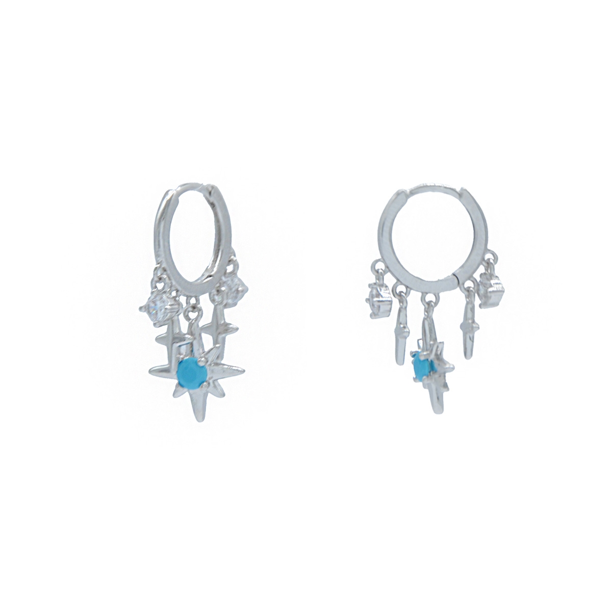 Mystically inspired our "Celestial Dream" earrings are playfully designed with delicate stars enhanced with brilliant blue and clear AAA cubic zirconia dancing from a sleek huggie hoop earrings. Sterling silver posts. Nickel and lead free jewellery.
