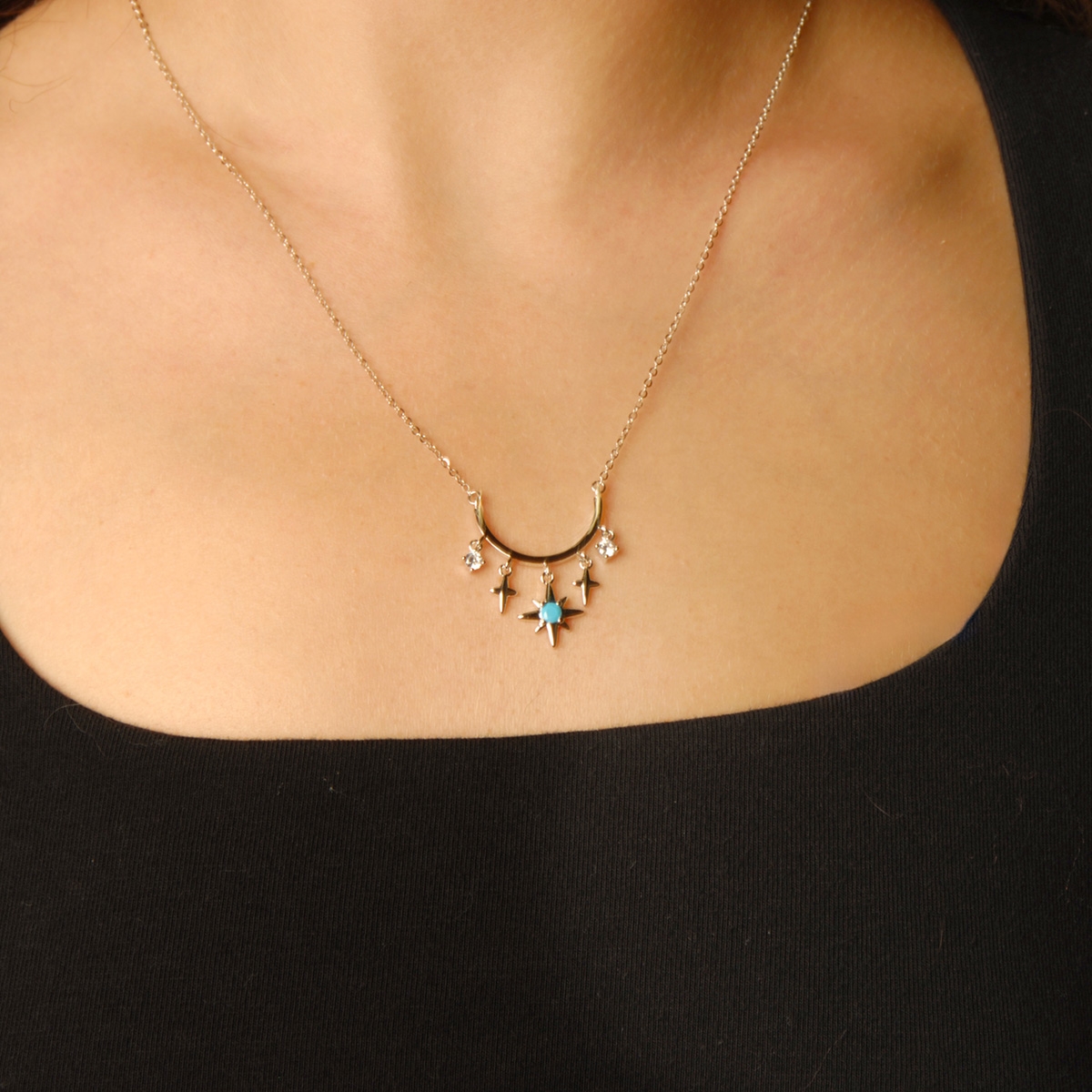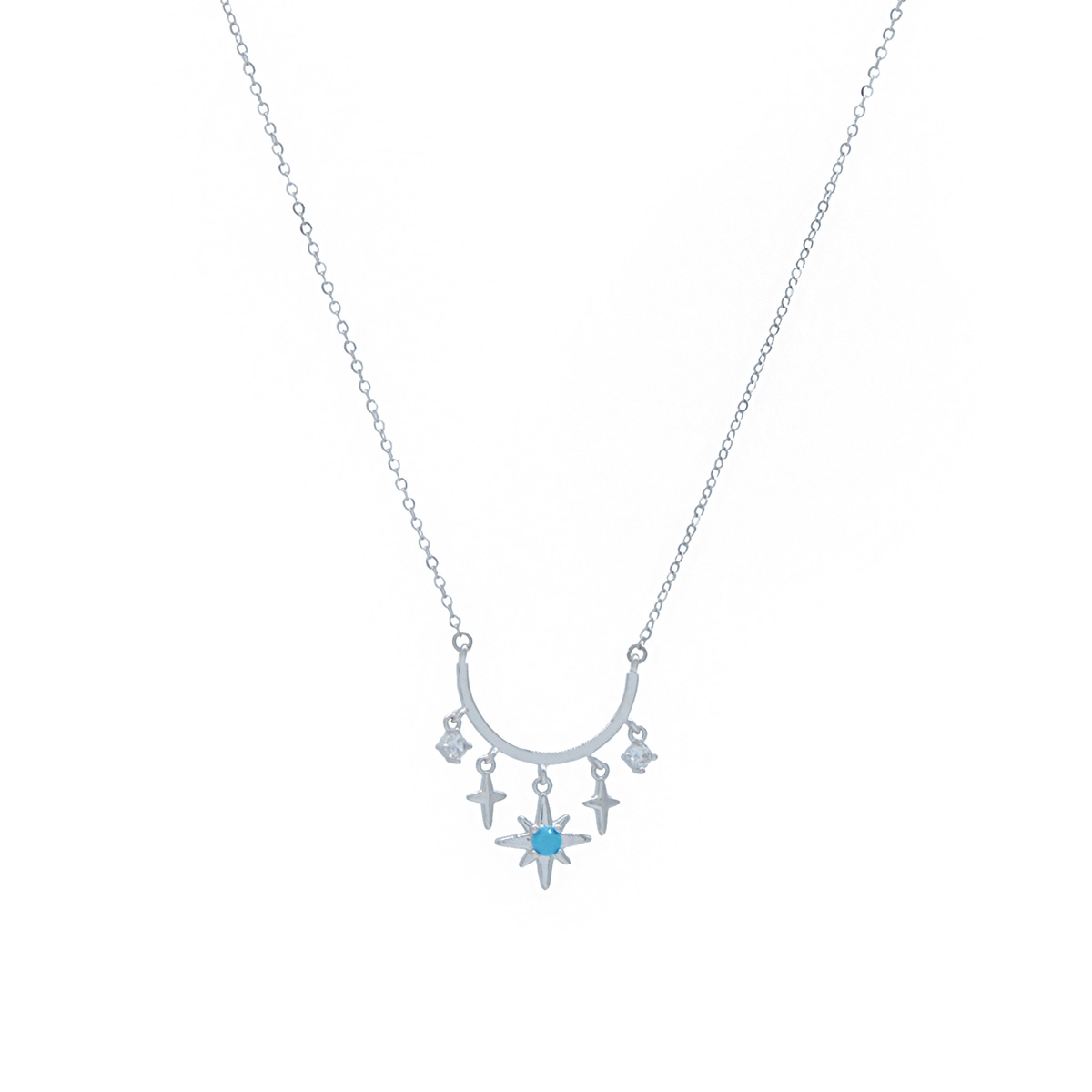 Mystically inspired our "Celestial Dream" neckpiece is playfully designed with delicate stars enhanced with brilliant blue and clear AAA cubic zirconia dancing from a half circle suspended from a 19" designer chain. Nickel and lead free jewellery.