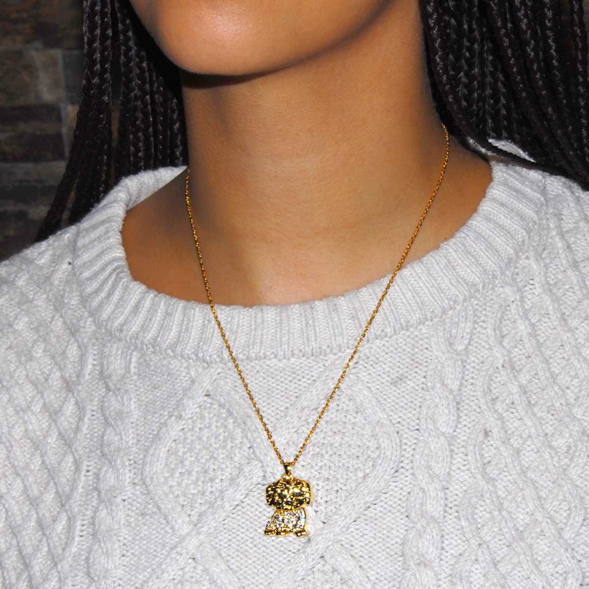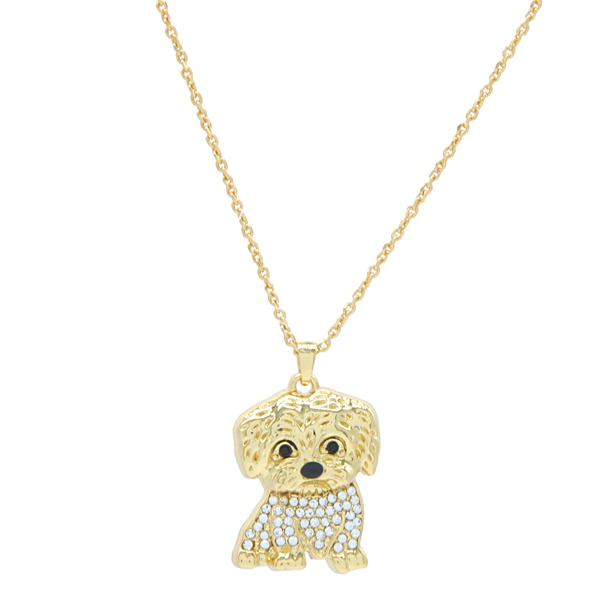 With his sweet little face and golden coat encrusted with Swarovski’s clear crystals, this "Charming Pup" drops from a fine 18" designer chain. Nickel and lead free jewellery.