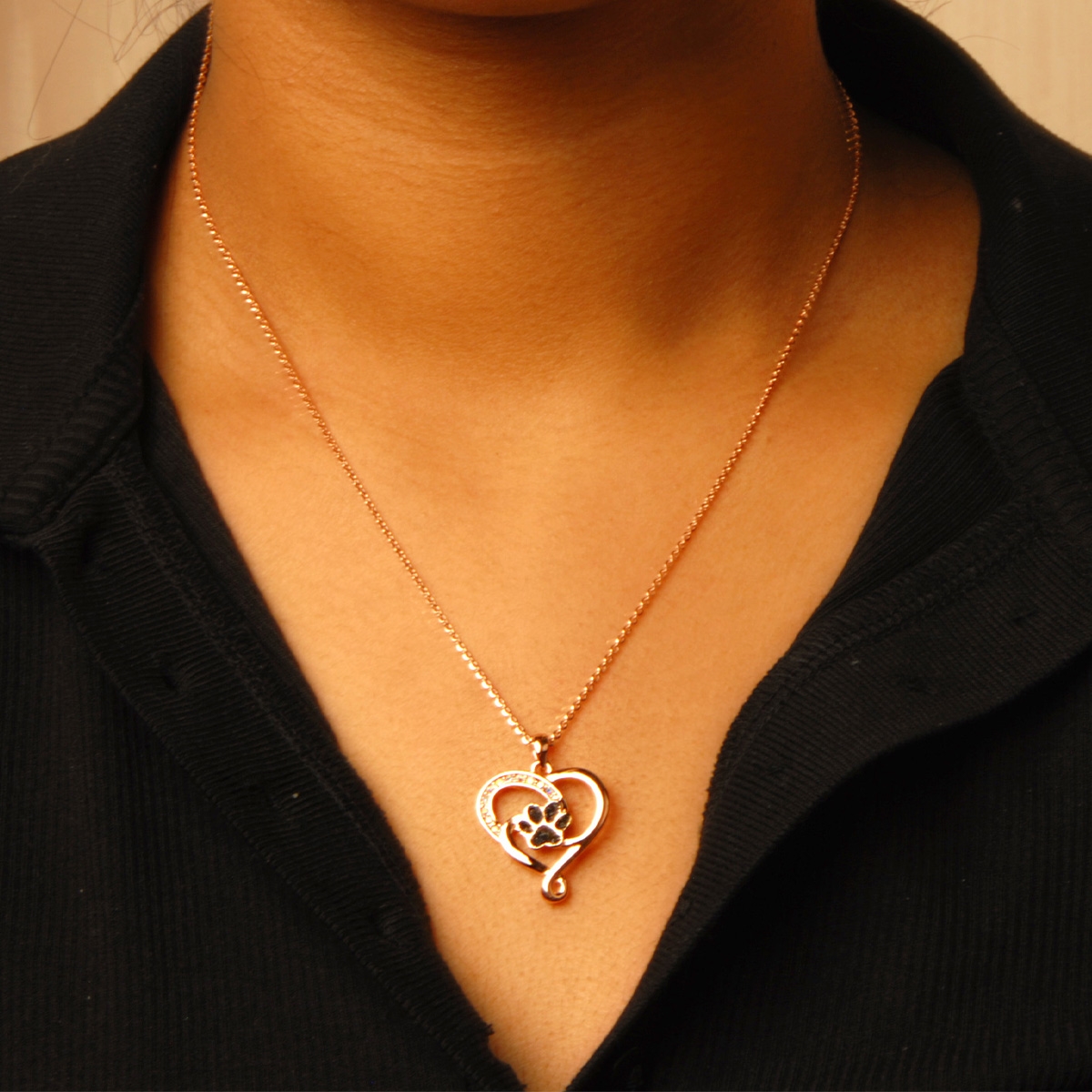 A sweet design for all of the pet lovers out there, our "Cherished Pup" neckpiece flaunts a beautiful heart shaped design adorned with sparkling Swarovski crystals linked with an adorable puppy print shimmering with black diamond dust. Suspended from an 18" designer chain, this lovely pendant showcases the adoration between pet owner and pet. Nickel and lead free jewellery.