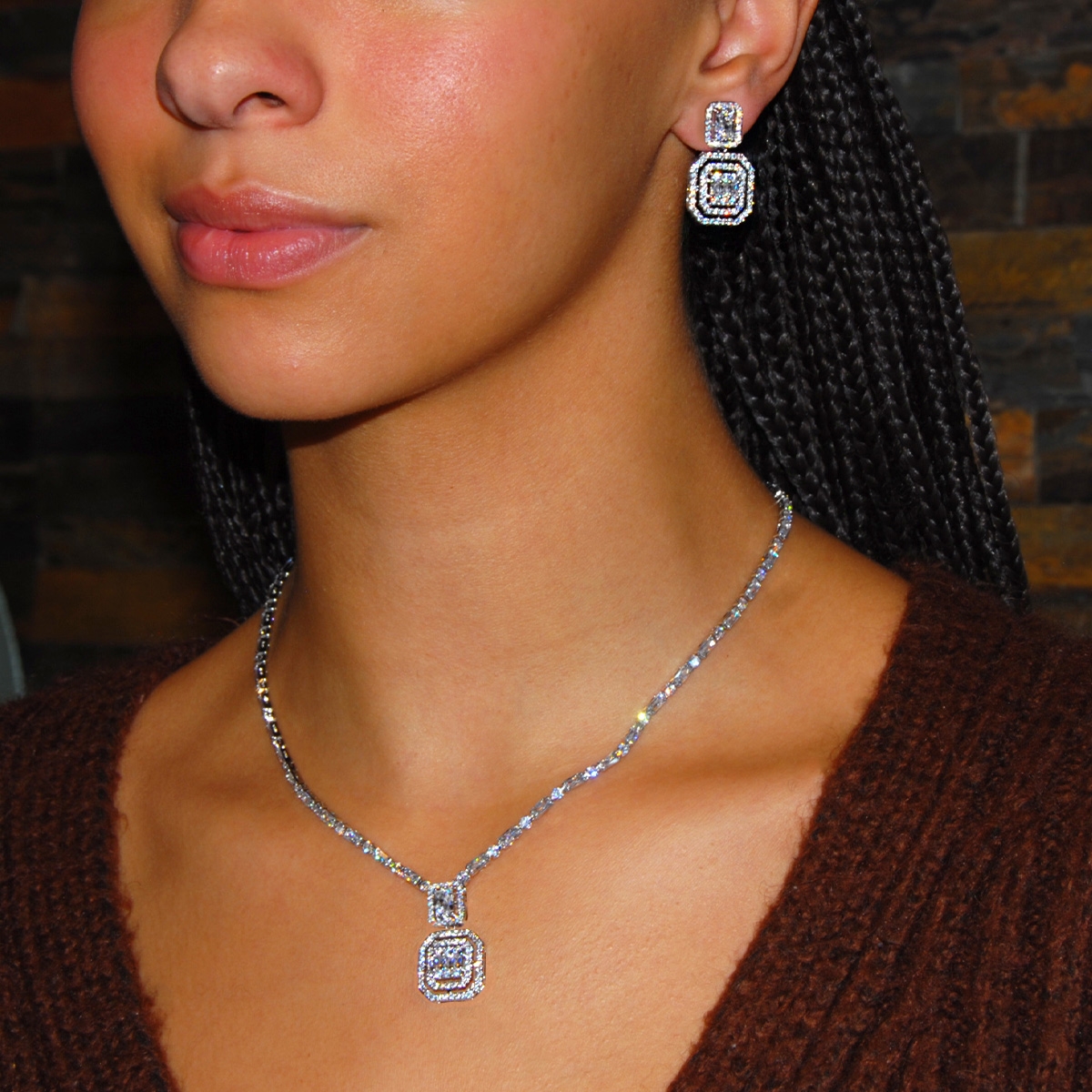 Our elegant and refined "Classic Affluence" set boasts a timeless design that will never go out of style. Featuring a stunning array of dancing clear AAA cubic zirconia, these luxurious fashion accessories will elevate your look with effortless ease. 17" neckpiece and stud earrings with sterling silver posts. Nickel and lead free jewellery.
