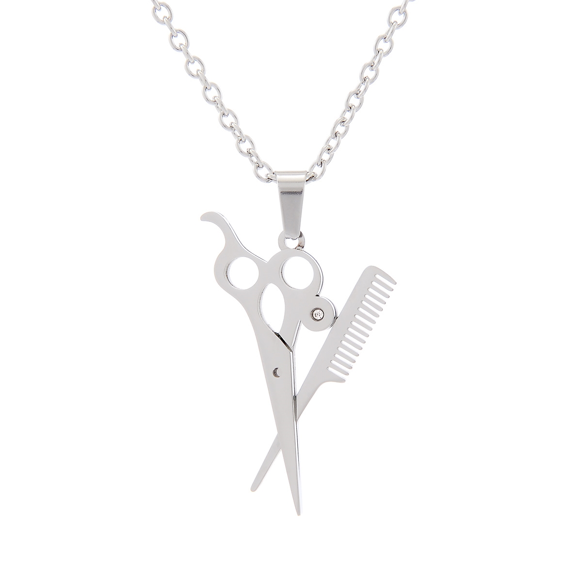 Perfect for any hair stylist our "Cut & Style" neckpiece flaunts a unique scissors and comb pendant. Finished in rich rhodium and adorned with a sparkling Swarovski crystal, this design will show off your sharp style. 24” neckpiece with 2” extension. Nickel and lead free jewellery.