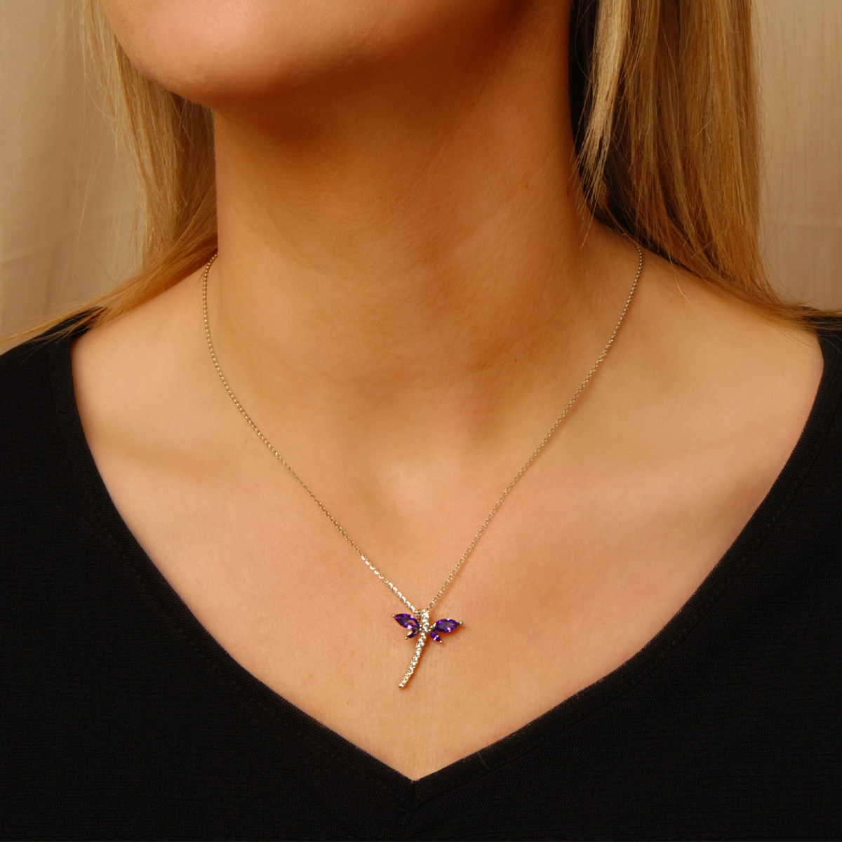 Inspired by one of nature's most lovely creatures, our "Dragonfly Dreams" neckpiece beautifully catches the likeness, flaunting a whimsical design embellished with bold purple and shimmering clear AAA cubic zirconia, suspended from a sleek 17” designer chain. Nickel and lead free jewellery.
