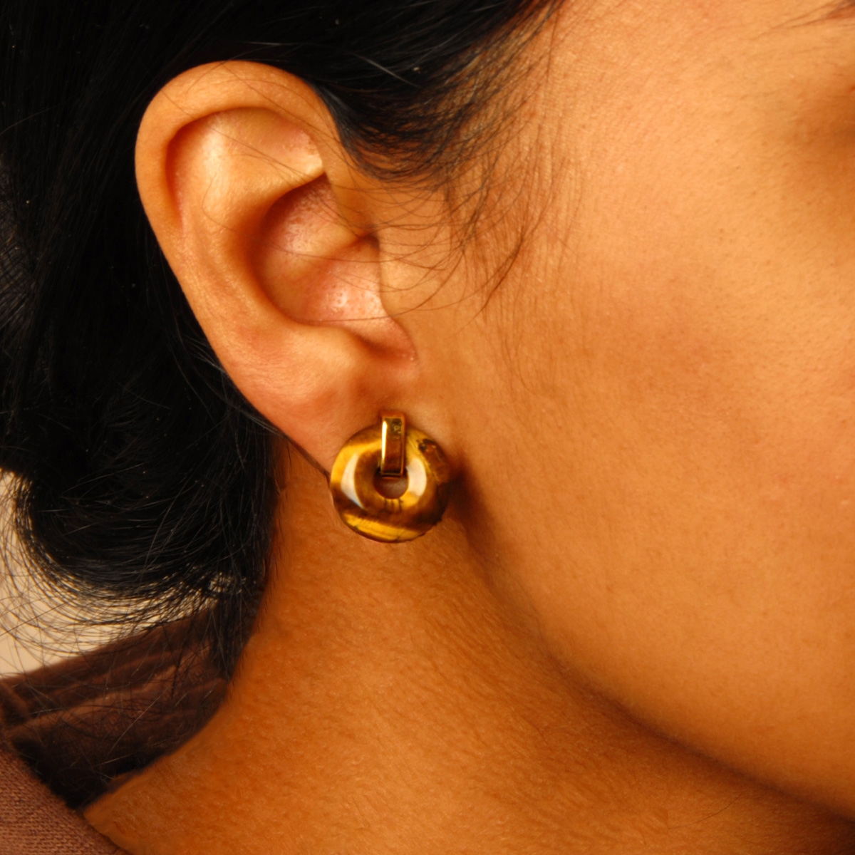 Add a beautiful pop of style to your look when you wear our "Eternally Trendy" earrings. Flaunting an open gemstone circle finished with a sleek golden bar, you are sure to make a naturally lovely fashion statement. Sterling silver posts. Nickel and lead free jewellery.