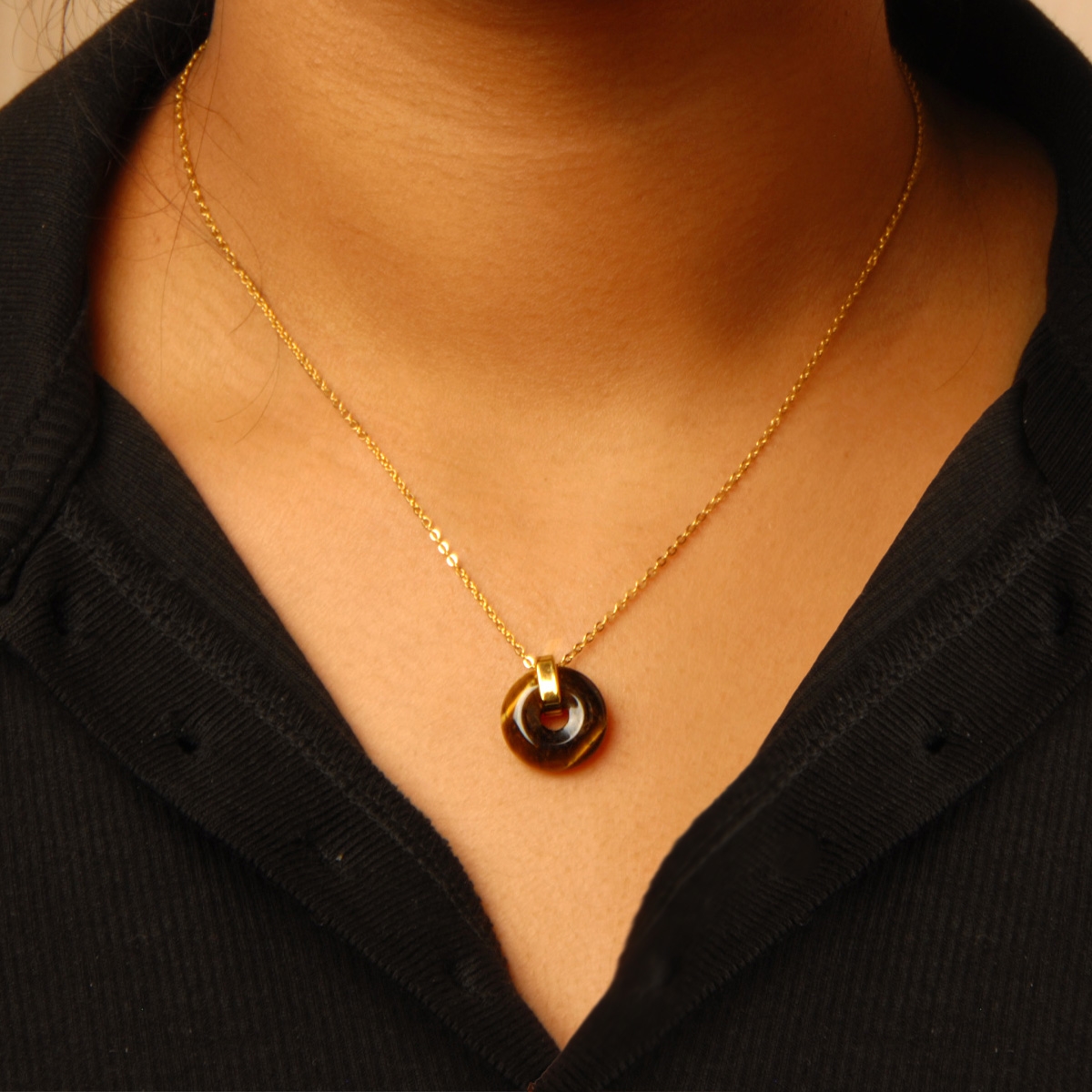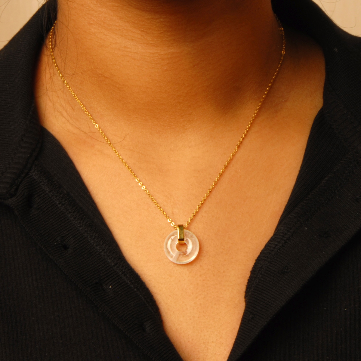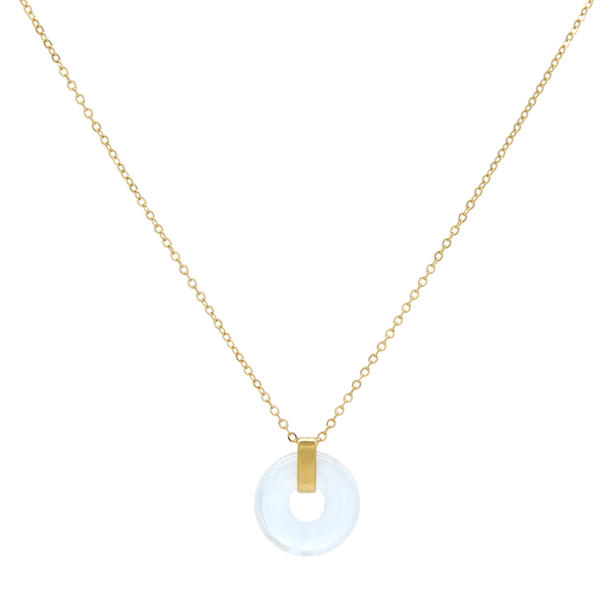 Add a beautiful pop of style to your look when you wear our "Eternally Trendy" neckpiece. Flaunting an open gemstone circle finished with a sleek golden bar suspended from a fine 18” designer chain you are sure to make a naturally lovely fashion statement. Nickel and lead free jewellery.