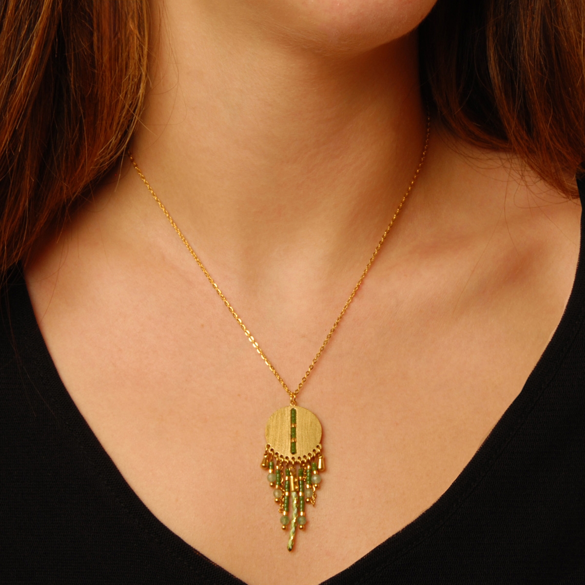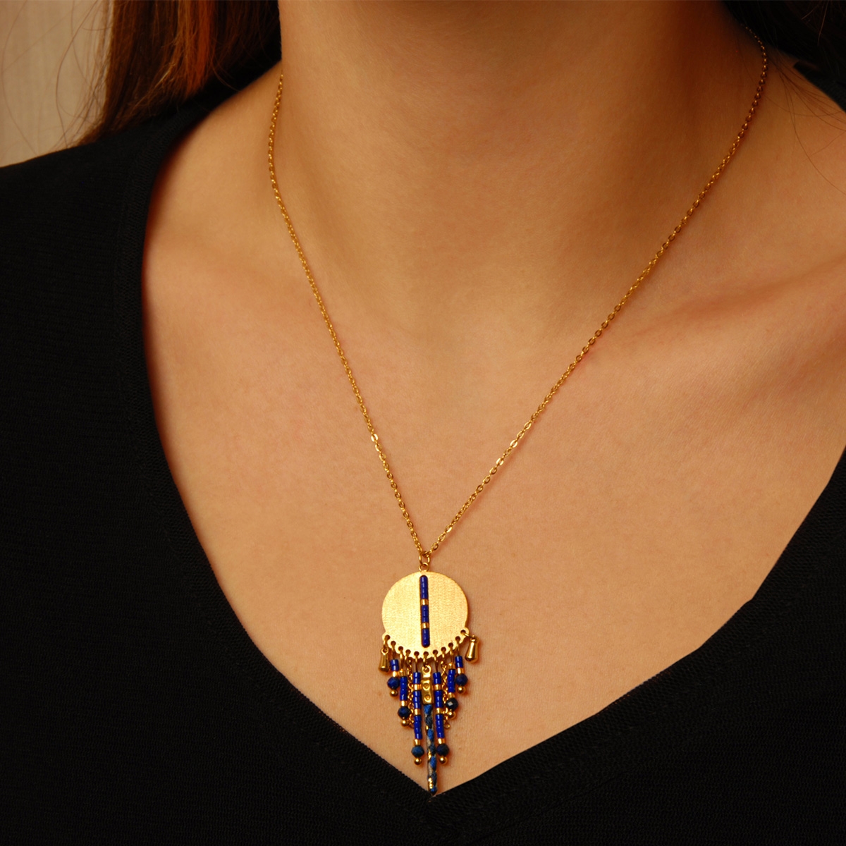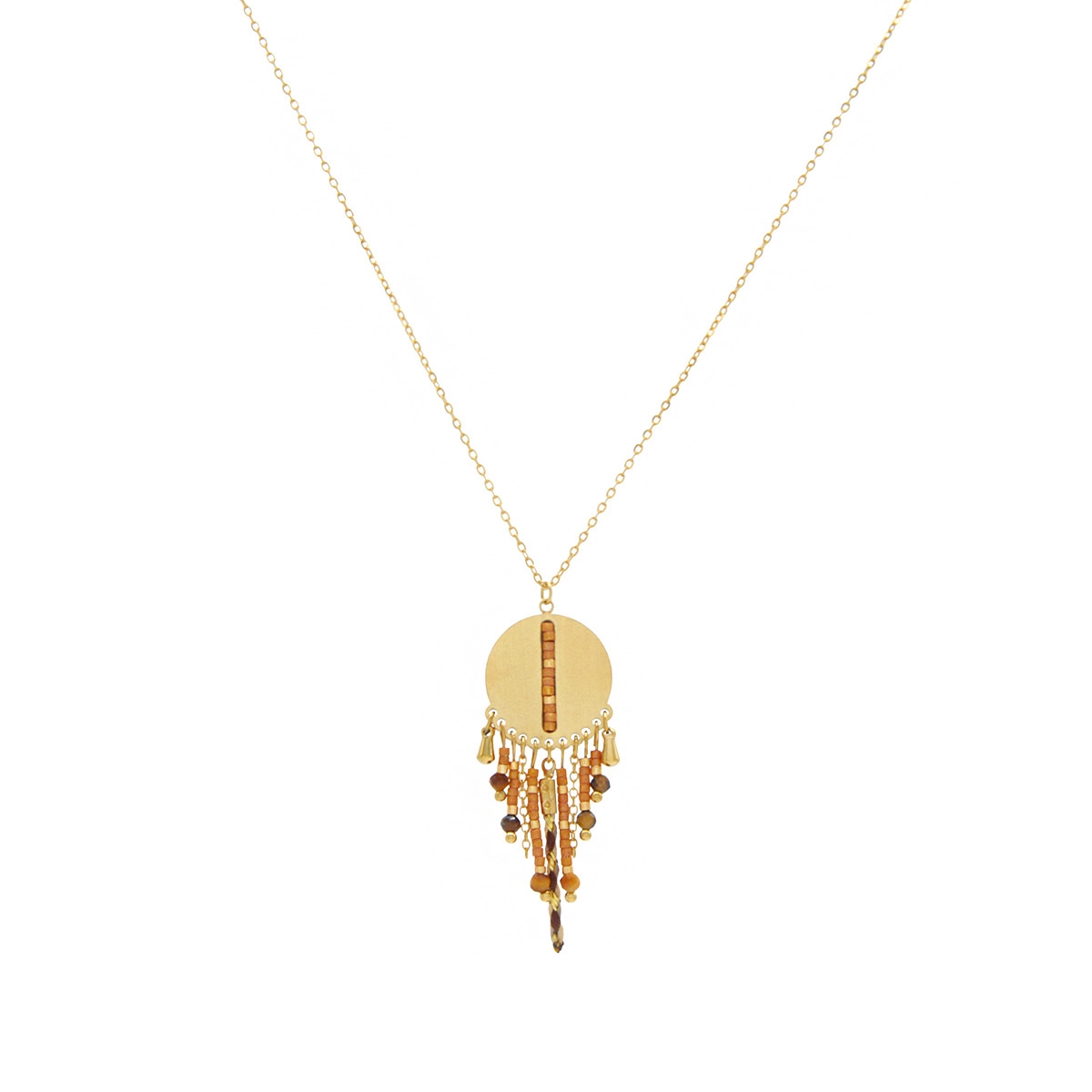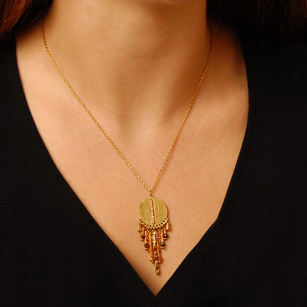 Our eye-catching "Ethnic Luxuries" neckpiece flaunts a stunning golden round adorned with a lustrous beaded center and dancing fringe on a 16" designer chain. This statement design is sure to have a rich impact on your look! Nickel and lead free jewellery.