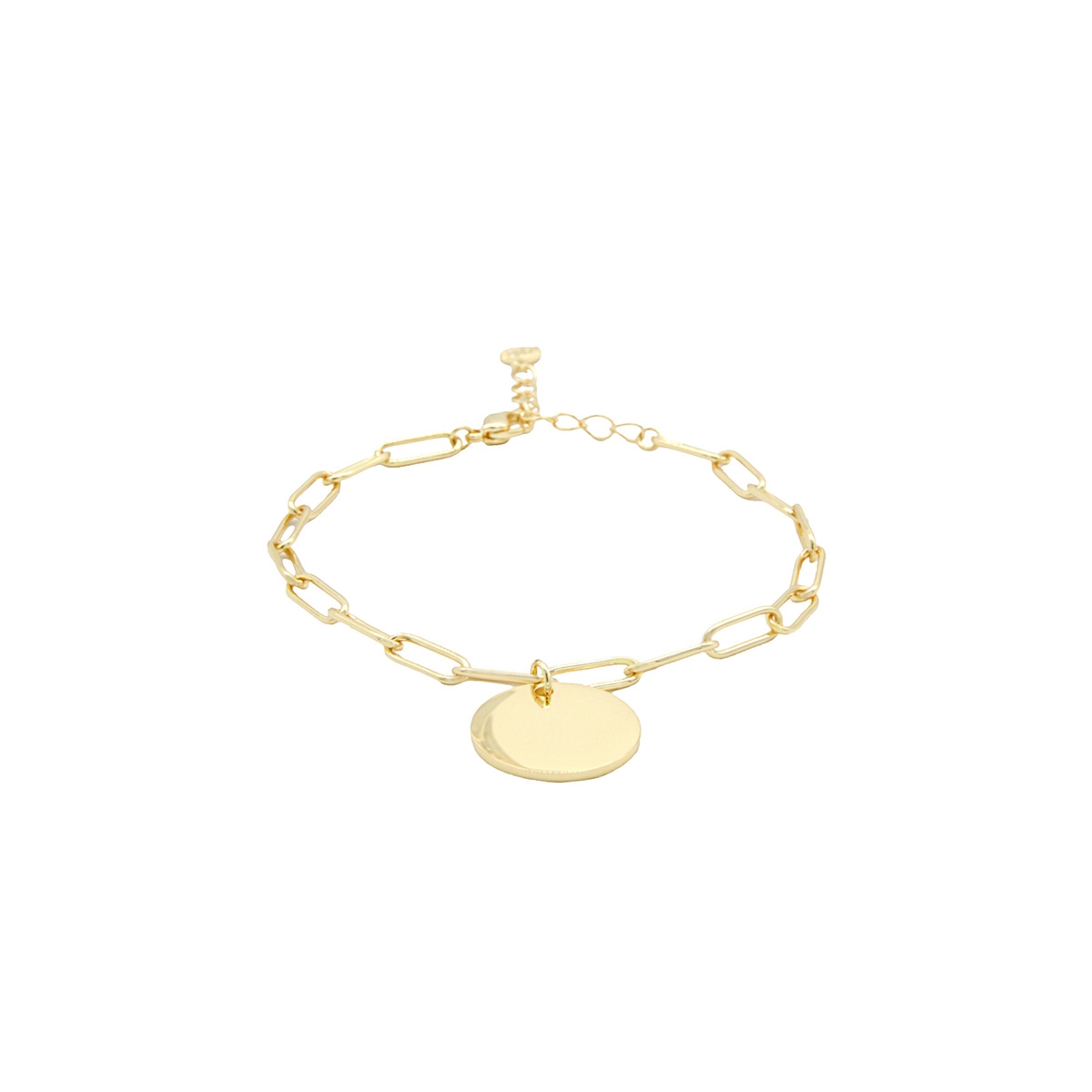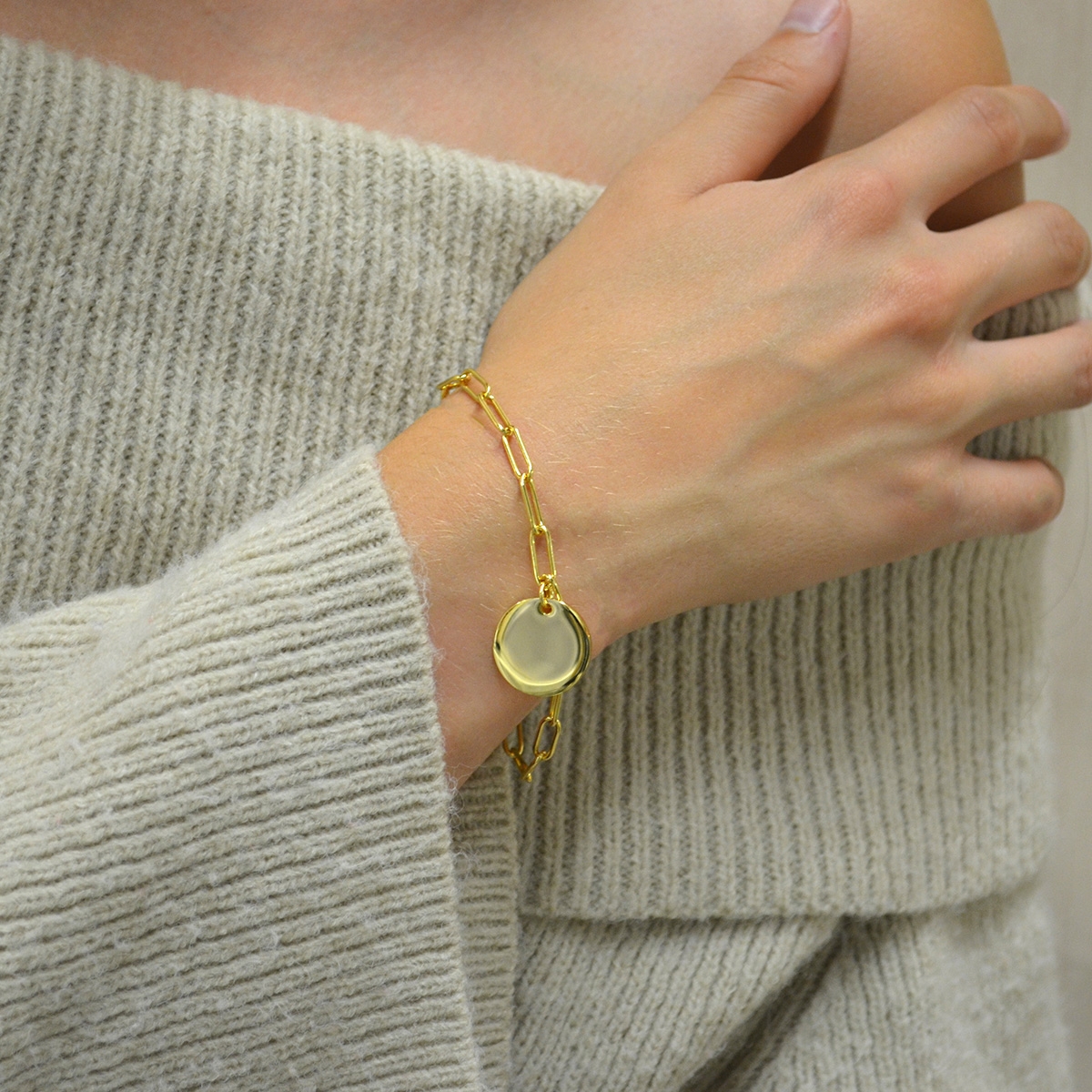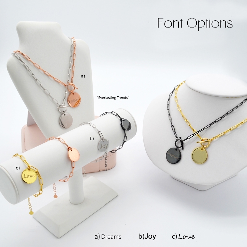 Fifth Avenue Collection is proud to release our new personalized line of jewellery. This trendy paperclip chain bracelet accompanied by a smooth medallion pendant with a space on the front for engraving is guaranteed to be a treasured everyday favorite. ** Using your orders special instructions section, please include the name or word you would like engraved (max one line and 8 characters) along with the font. For example: Madison, font c. Engraving included in the price. Stainless steel. Nickel and lead free jewellery.