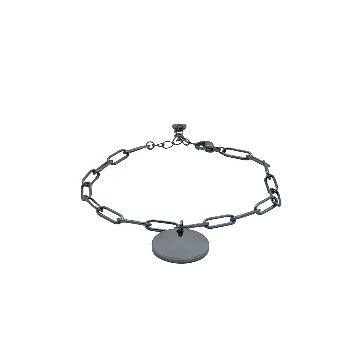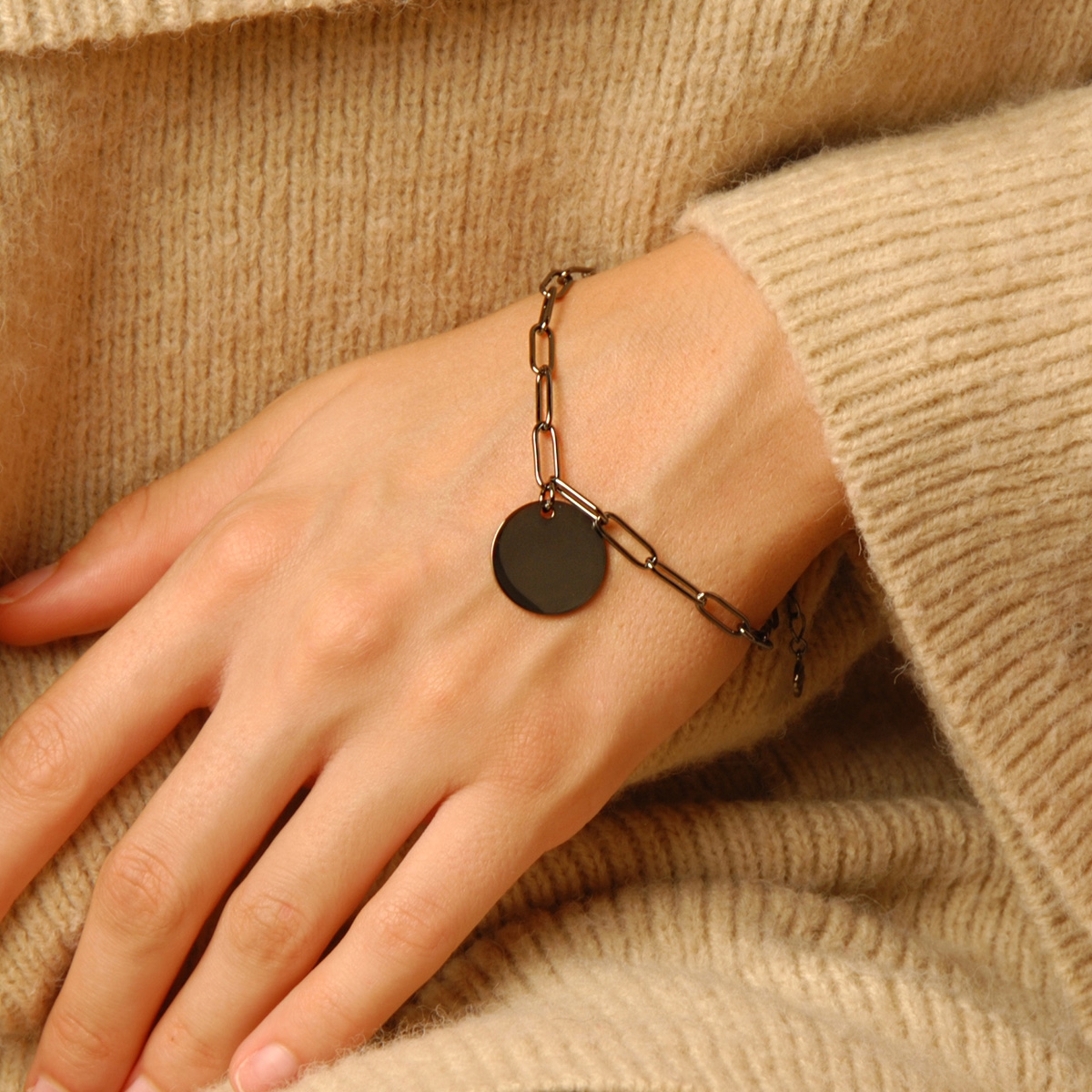 Fifth Avenue Collection is proud to release our new personalized line of jewellery. This trendy paperclip chain bracelet accompanied by a smooth medallion pendant with a space on the front for engraving is guaranteed to be a treasured everyday favorite. ** Using your orders special instructions section, please include the name or word you would like engraved (max one line and 8 characters) along with the font. For example: Madison, font c. Engraving included in the price. Stainless steel. Nickel and lead free jewellery.