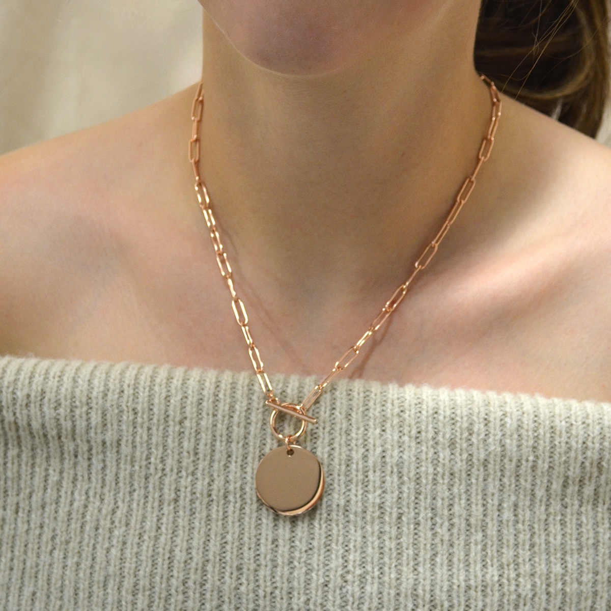Fifth Avenue Collection is proud to release our new personalized line of jewellery. This trendy paperclip chain accompanied by a smooth medallion pendant with a space on the front for engraving is guaranteed to be a treasured everyday favorite. ** Using your orders special instructions section, please include the name or word you would like engraved (max one line and 8 characters) along with the font. For example: Madison, font c. Engraving included in the price. Stainless steel. Nickel and lead free jewellery.
