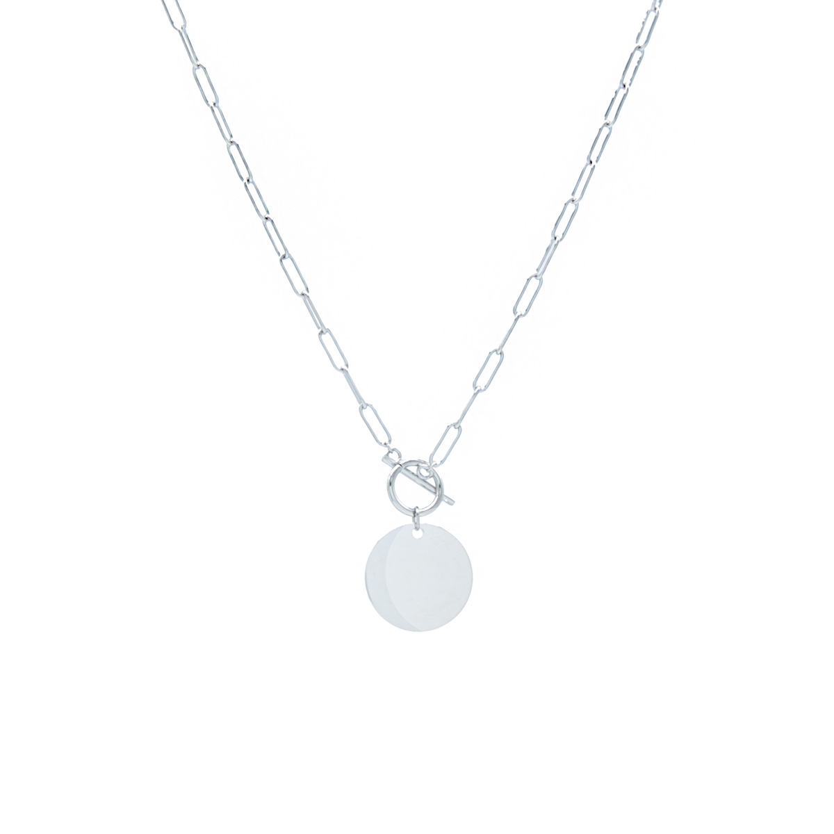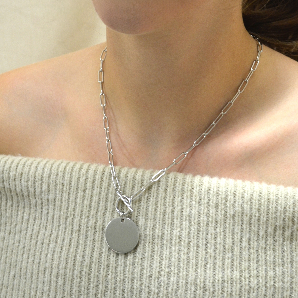 Fifth Avenue Collection is proud to release our new personalized line of jewellery. This trendy paperclip chain accompanied by a smooth medallion pendant with a space on the front for engraving is guaranteed to be a treasured everyday favorite. ** Using your orders special instructions section, please include the name or word you would like engraved (max one line and 8 characters) along with the font. For example: Madison, font c. Engraving included in the price. Stainless steel. Nickel and lead free jewellery.