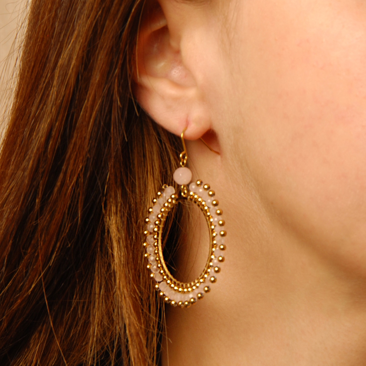 Make an audacious fashion statement with our gorgeously unique "Exotic Detailing" earrings. Featuring a unique and bold geometric design showcasing alluring genuine gemstone beads in a stunning circle finished in gleaming gold suspended from sleek sterling silver hooks. Nickel and lead free jewellery.