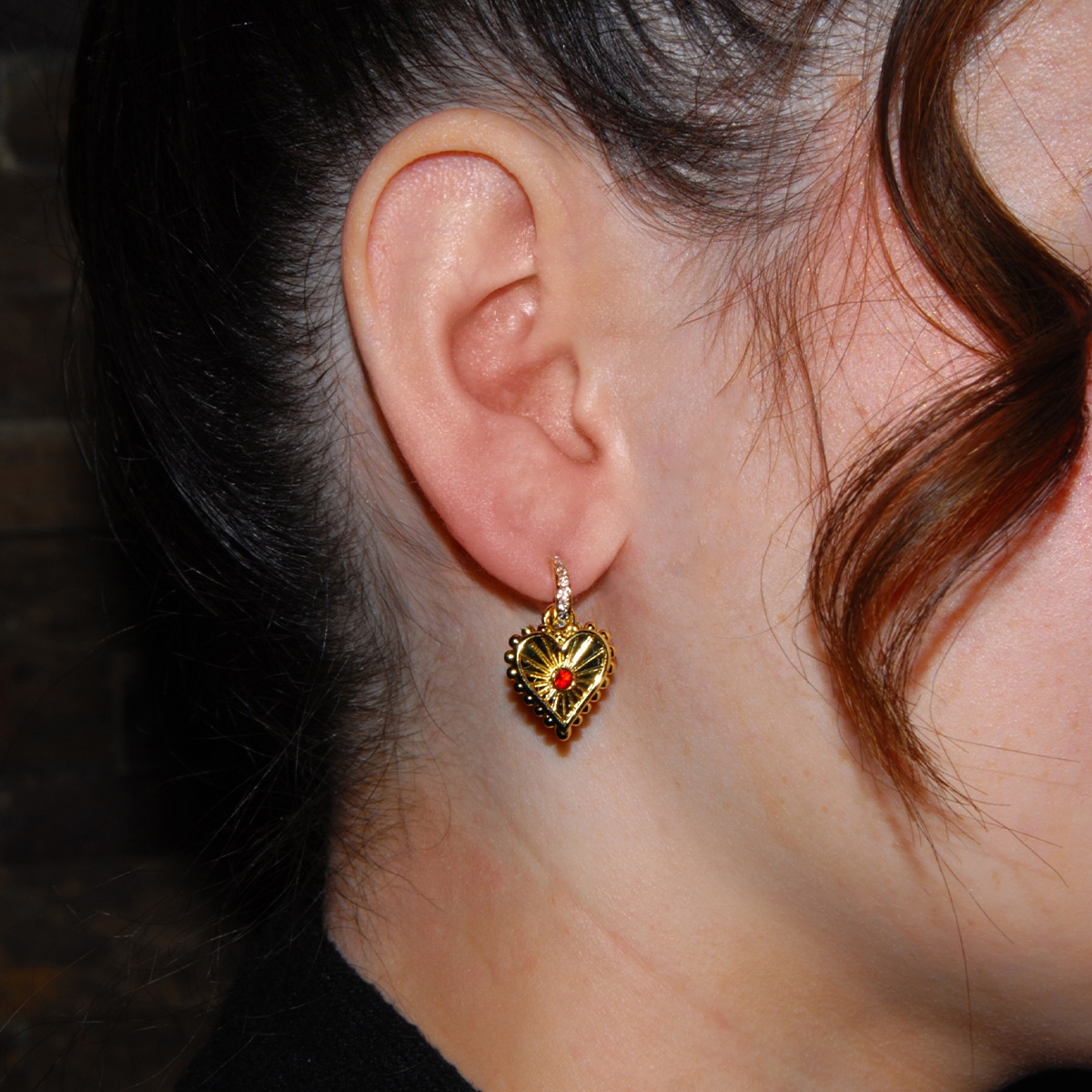 Rich and lovely, our "Expression Of Love" earrings feature textured golden hearts with beautiful red Swarovski crystal centers adorning a sparkling half-loop encrusted with clear Swarovski crystal. Sterling silver posts. Nickel and lead free jewellery.