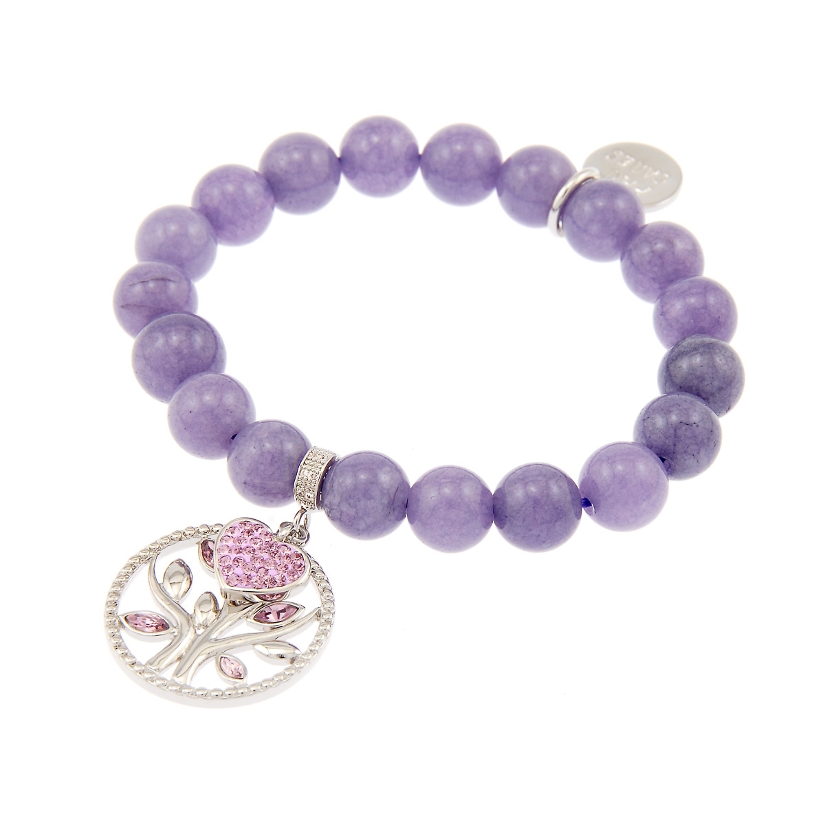 This beautiful stretch bracelet features smooth purple genuine agate beads centered with a rich rhodium finished roundel encrusted with AAA cubic zirconia. Two enchanting charms adorned with light amethyst Swarovski crystal complete this lovely design. Nickel and lead free jewellery.