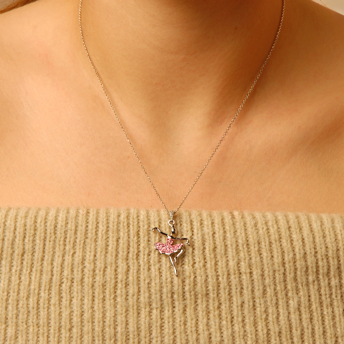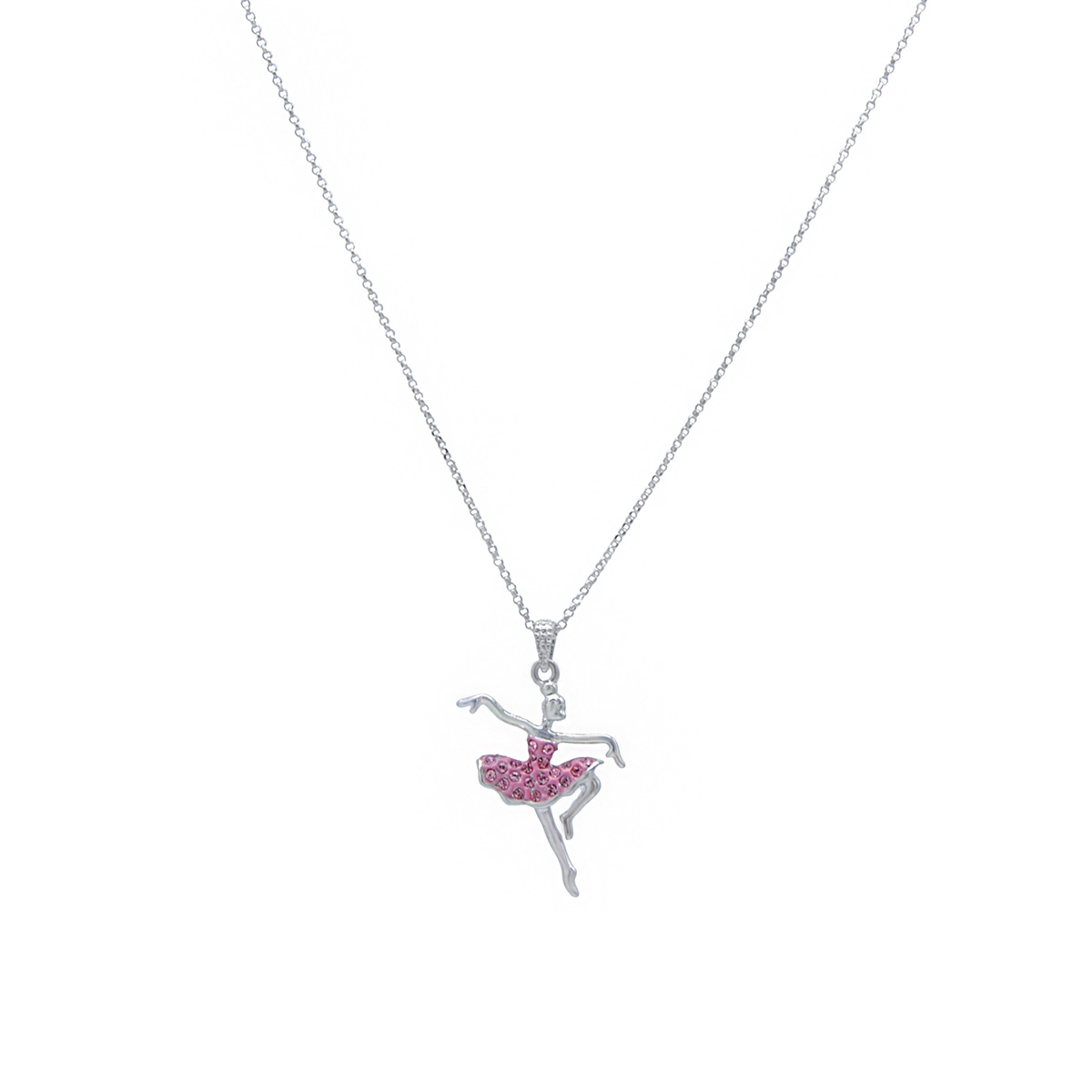 Watch our "Fancy Dancer" catch the spotlight with her exquisite design! Glittering in her pink Swarovski crystal dress, this graceful beauty is adorned on a sleek 16" designer chain. Nickel and lead free jewellery.