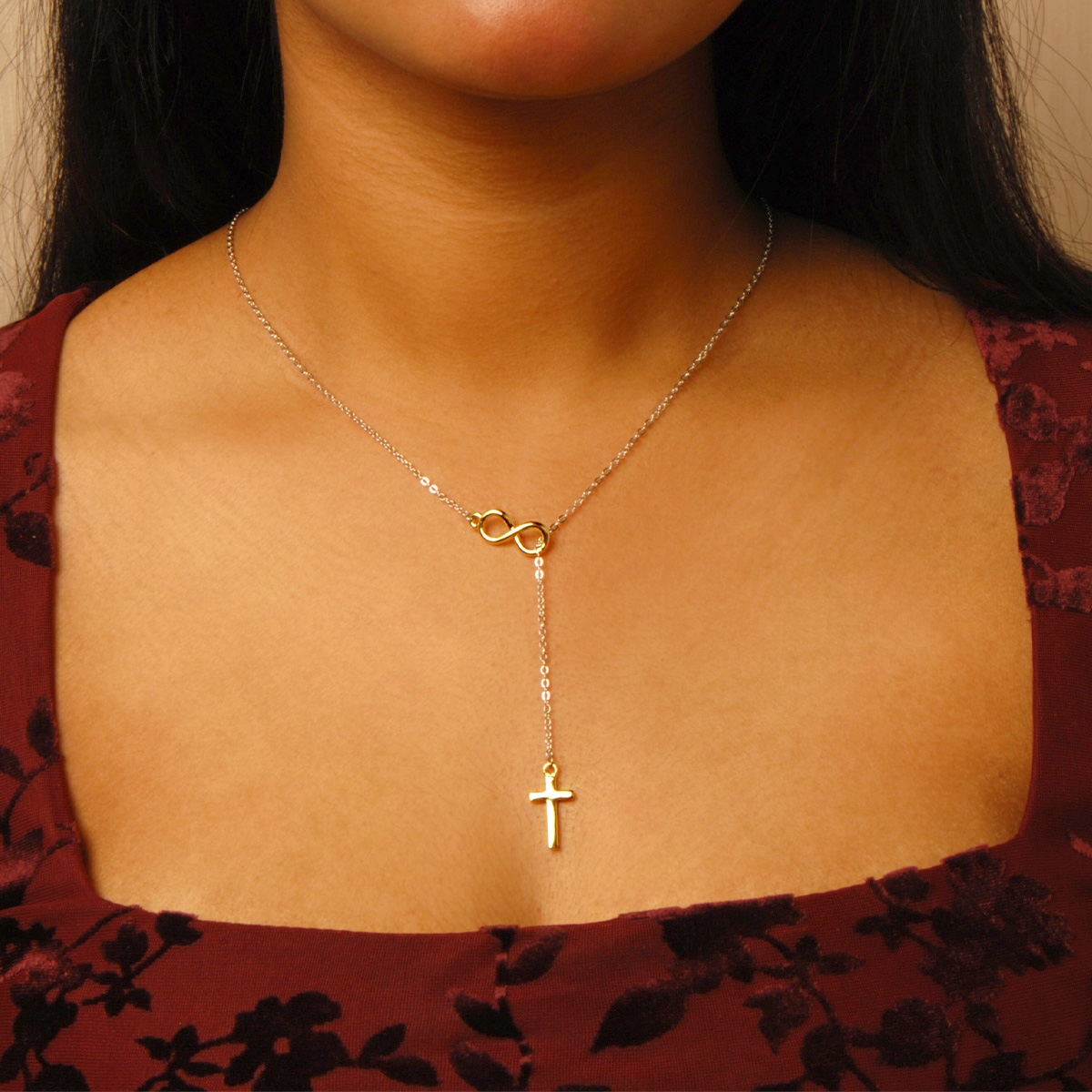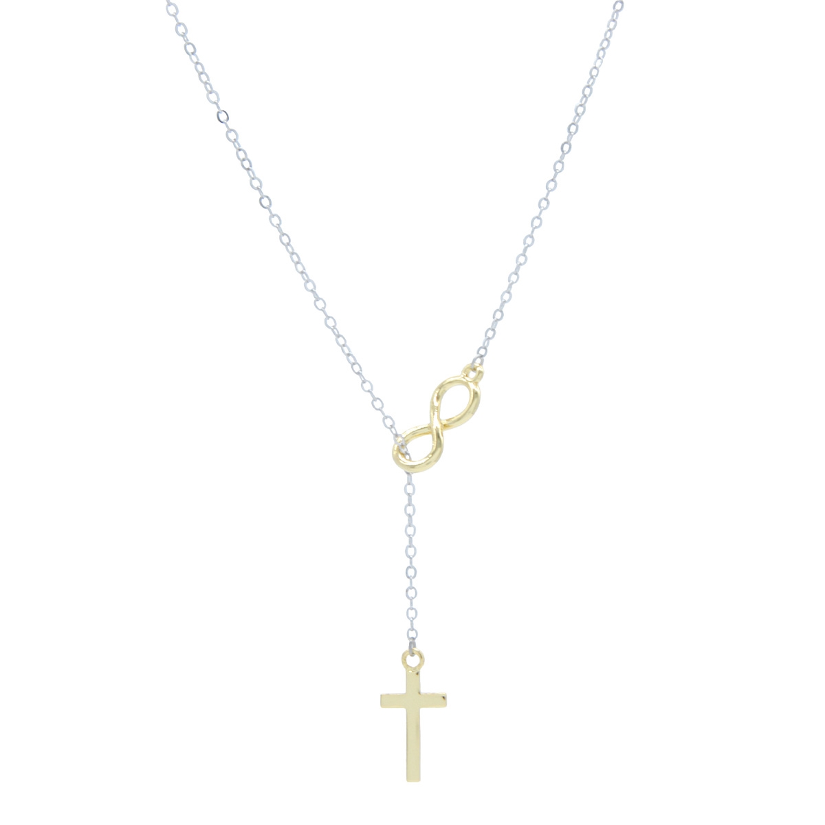 Make a statement of faith when you wear our stylish and sleek "Forever Divine" neckpiece. Flaunting a lariat style chain adorned with a smooth cross and infinity symbol, this two-tone design is both modern and meaningful. 18" neckpiece with 2" extension. Nickel and lead free jewellery.