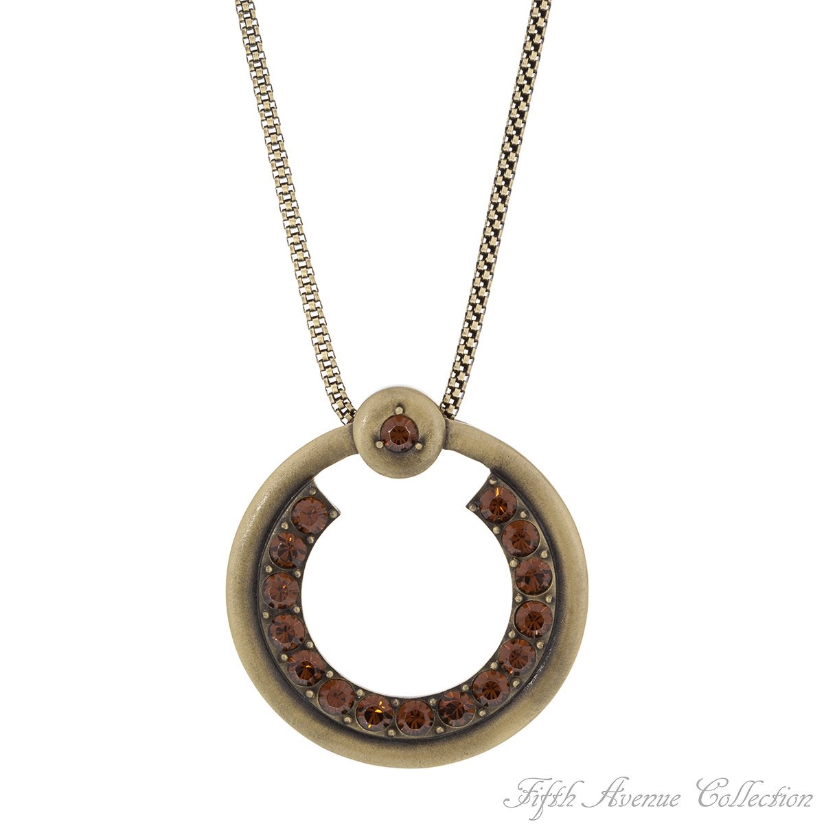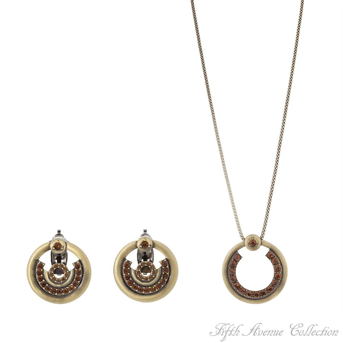 Large circles finished in antique copper sparkle with Swarovski topaz crystals, the color of delectable “Iced Coffee”. A complimenting rolled chain and mystic-glam look makes a bold fashion statement. Designed especially for the woman who loves the unusual. Earrings with 14K posts or adjustable clips and 18” neckpiece with 2” extension, set.Nickel and lead free.
