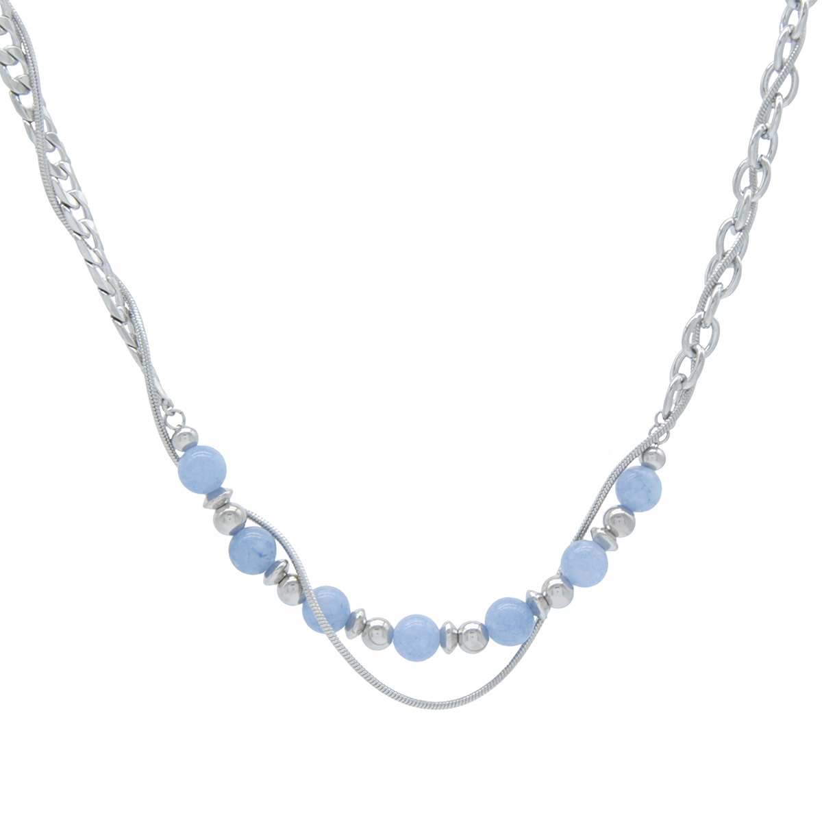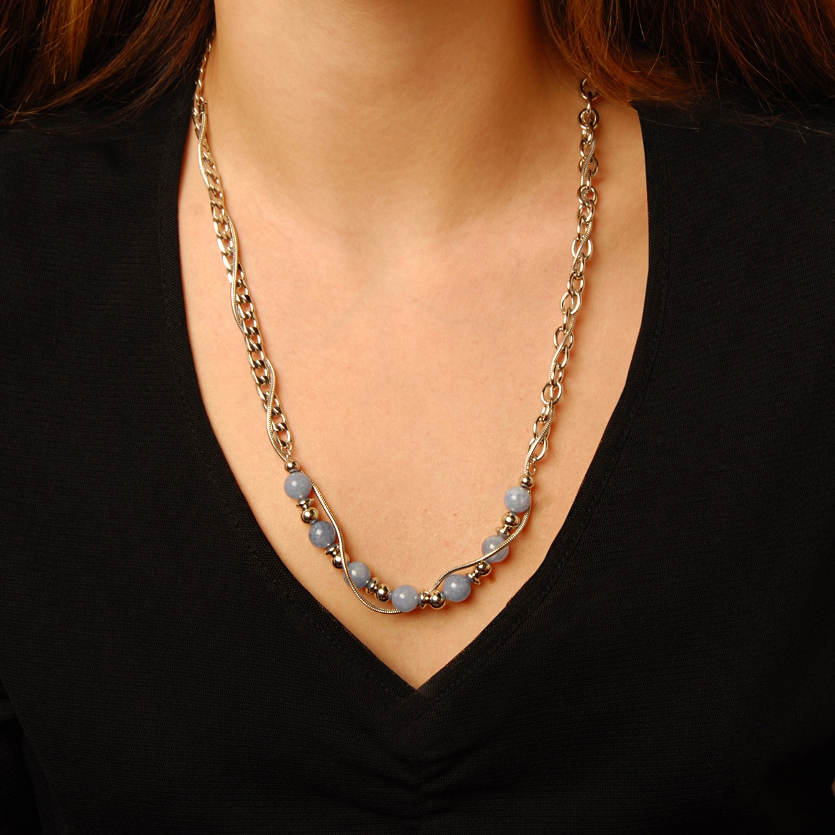 Drawing on inspiration from a beautiful array of soft blue agate and rich rhodium finished metallics, our "Interlaced Blues" neckpiece flaunts a stunningly unique design, providing you with calm healing properties in a chic fashion accessory that compliments any style. 22" neckpiece with extension. Nickel and lead free jewellery.