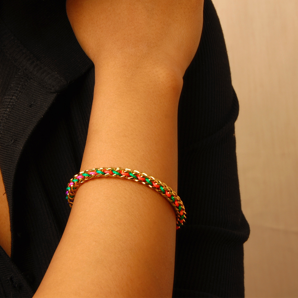 Pile on the style with our innovative "Interwoven Details" bracelet that combines chunky on-trend chain with smooth strands of thread. Wear this modish design to give your look a stunning, ultramodern edge. Nickel and lead free jewellery.