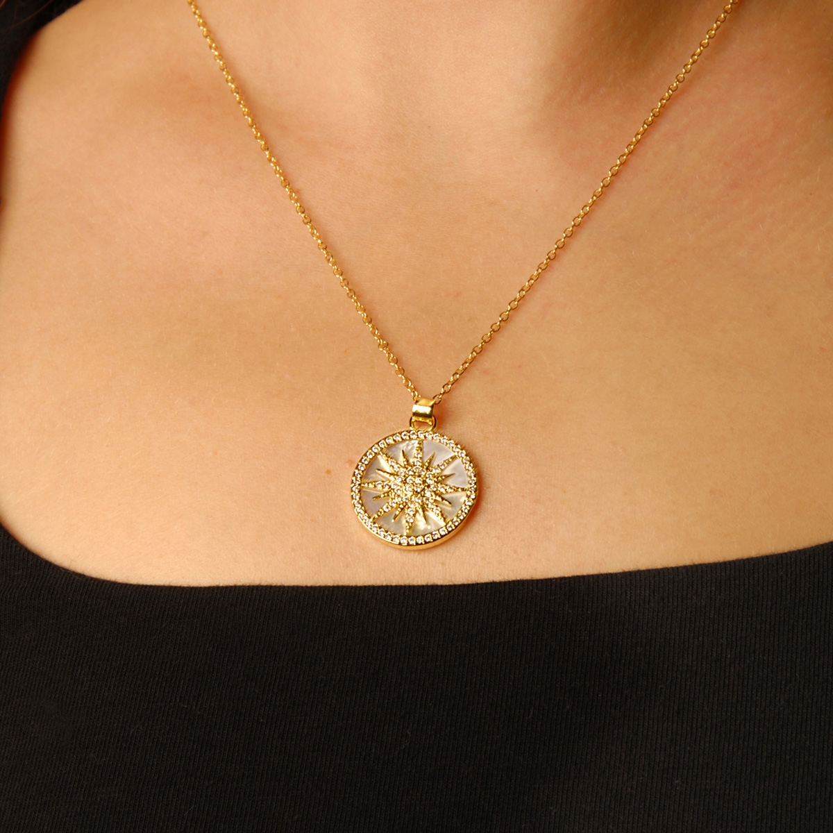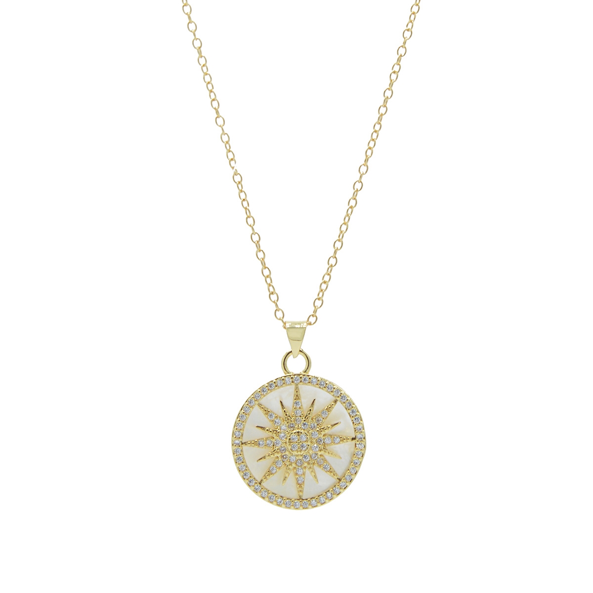 Glimmer and glow when you wear our sparkling "Lustrous Rays" neckpiece. Showcasing a stunning mother of pearl medallion encrusted with a glittering Swarovski crystal overlay suspended from a sleek 18" designer chain, this FAC must-have is the perfect jewellery to make your look shine! Nickel and lead free jewellery.