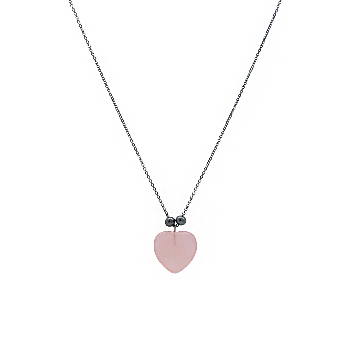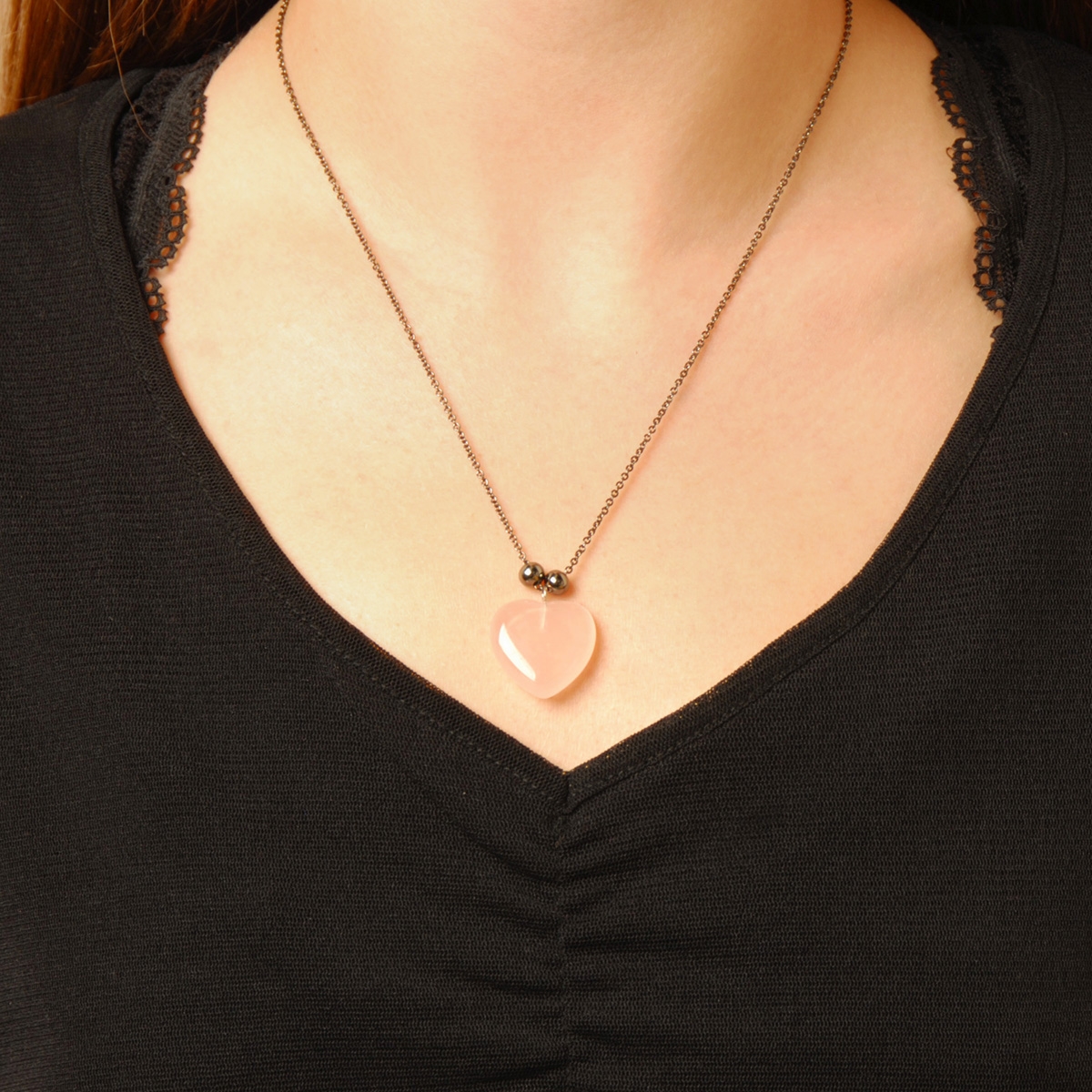 Known as the love stone, this stunning "Naturally Pink" design features a calming and powerful natural rose quartz heart on a bold hematite finished 18" designer chain. Nickel and lead free jewellery.