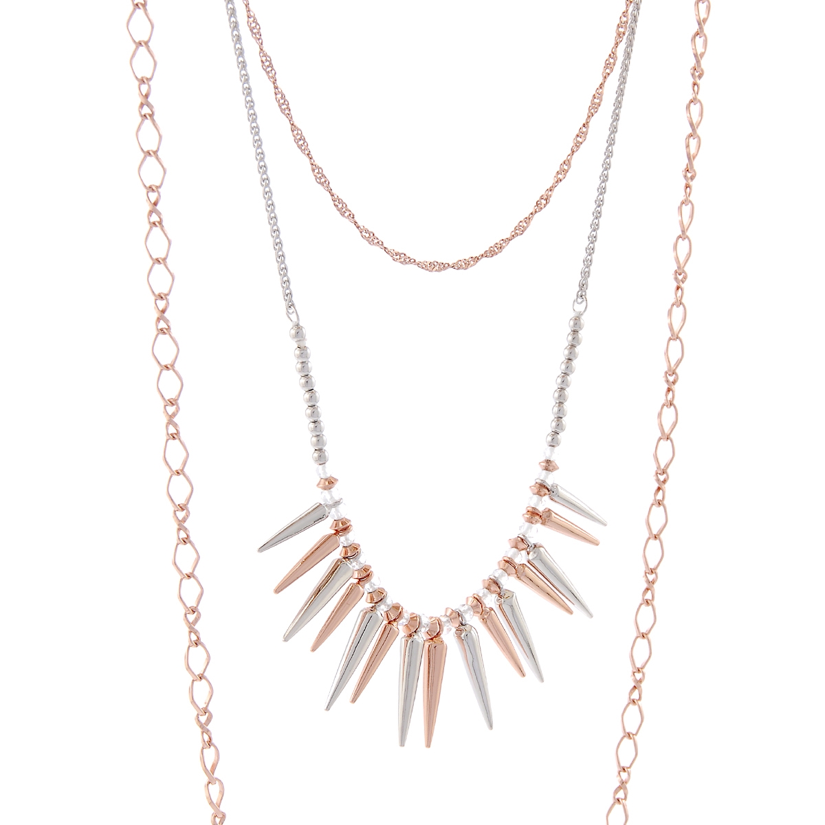 Make a fashion statement when you wear our edgy “Power Glam” neckpiece. Its beautifully entrancing layers of rose gold, rich rhodium, crystal beads and spiked metal detailing command attention. 16" neckpiece with 2" extension. Nickel and lead free.