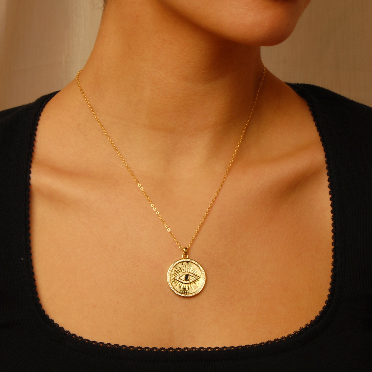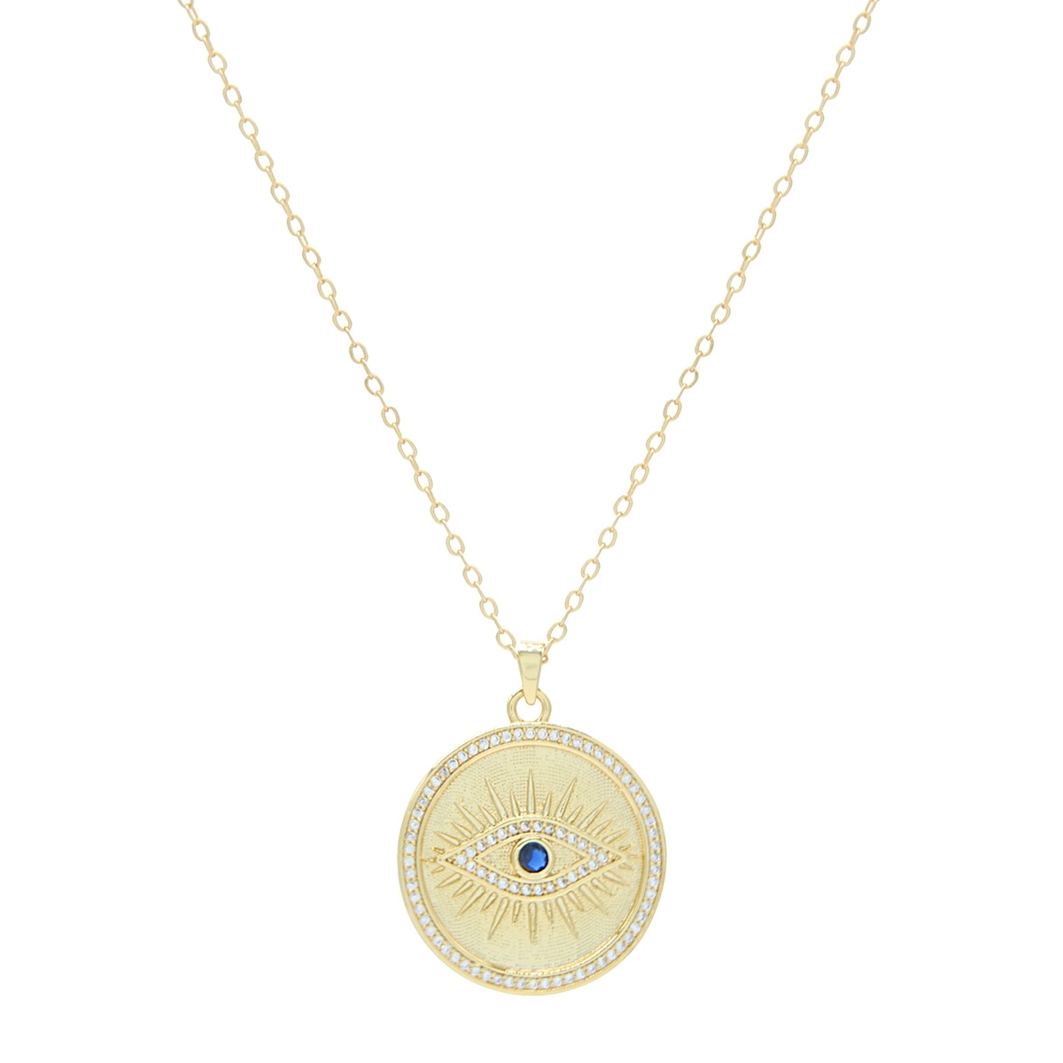 Sheild your energy with our on-trend "Protection & Beauty" neckpiece. Flaunting a stunning evil eye design with AAA cubic zirconia detailing in a smooth golden medallion, this ancient protective symbol meets modern design. 18" neckpiece with 2" extension. Nickel and lead free jewellery.