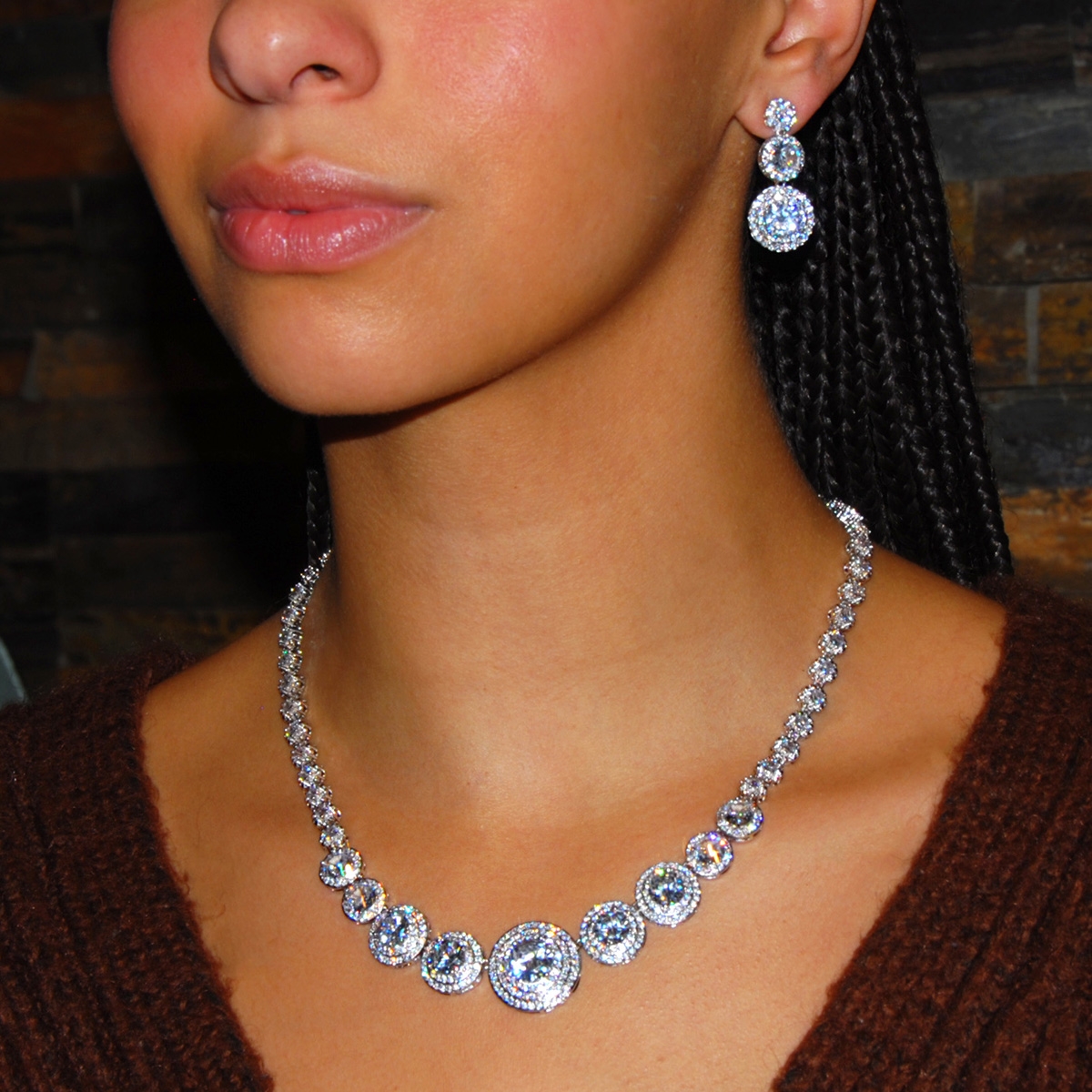 Decidedly rich, definitely glamorous, our "Rounded Opulence" neckpiece and earring set wastes not a minute on minimalism but instead, is a study in eye-catching luxury. Brilliant cut AAA cubic zirconia in a beautiful combination of sizes create an elegant look for any special occasion. 17" neckpiece and stud earrings with sterling silver posts. Nickel and lead free jewellery.