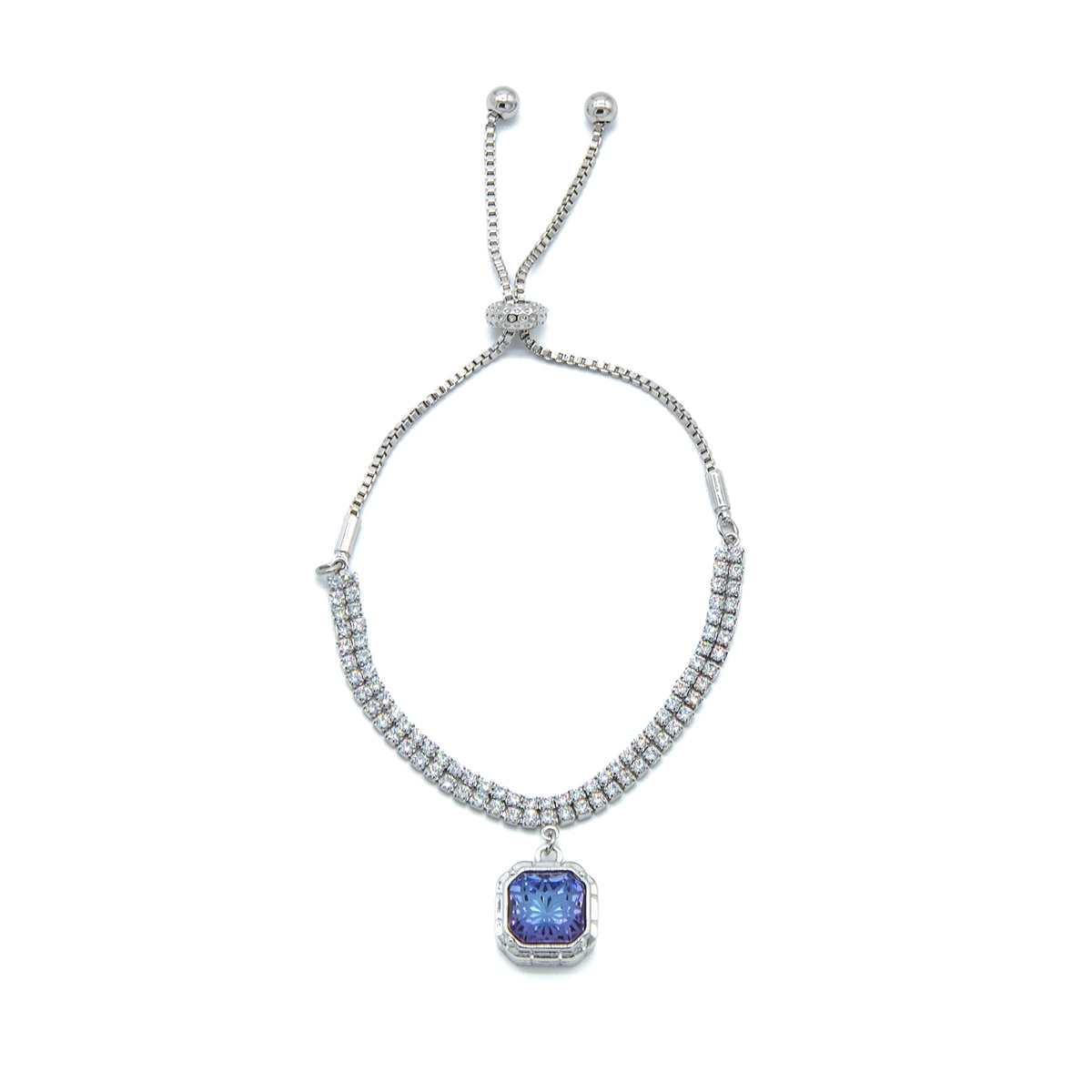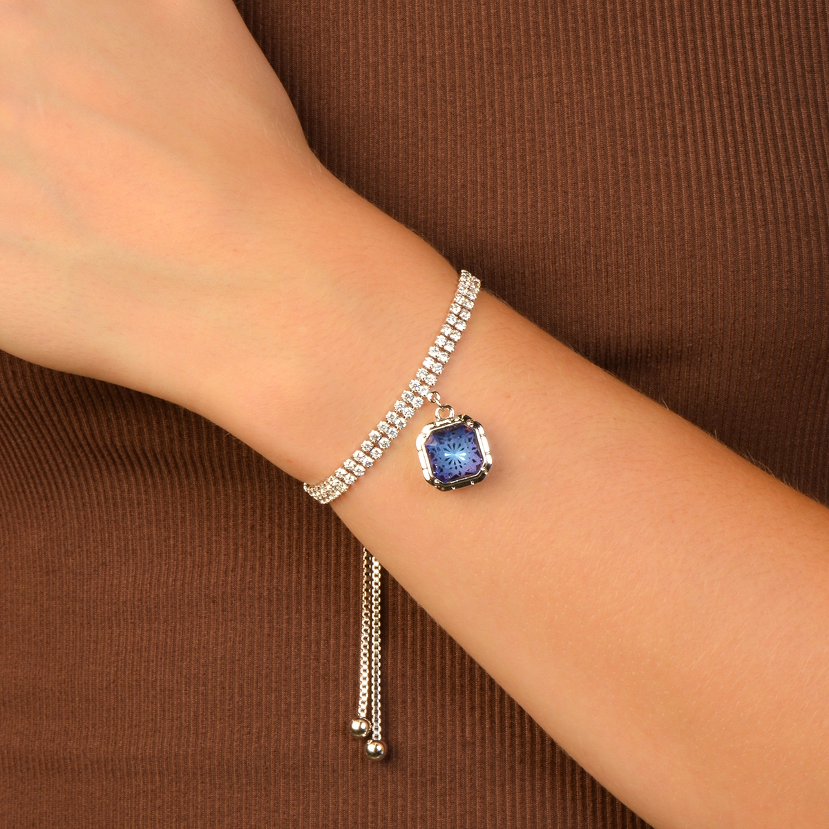 Our gorgeous "Royal Blue Luxury" bracelet flaunts a stunningly unique etched European glass crystal charm dropping gracefully from an exquisite double row of sparkling AAA cubic zirconia clears to add glamour to your look with ease! 7.5" bracelet with easy-to-wear drawstring closure. Nickel and lead free jewellery.