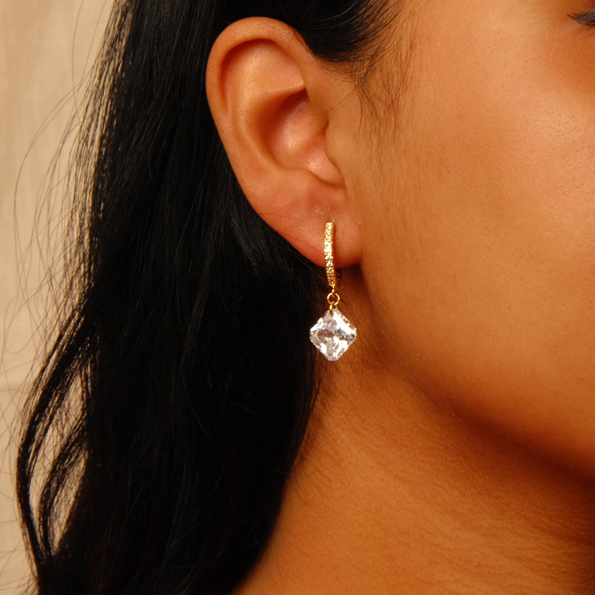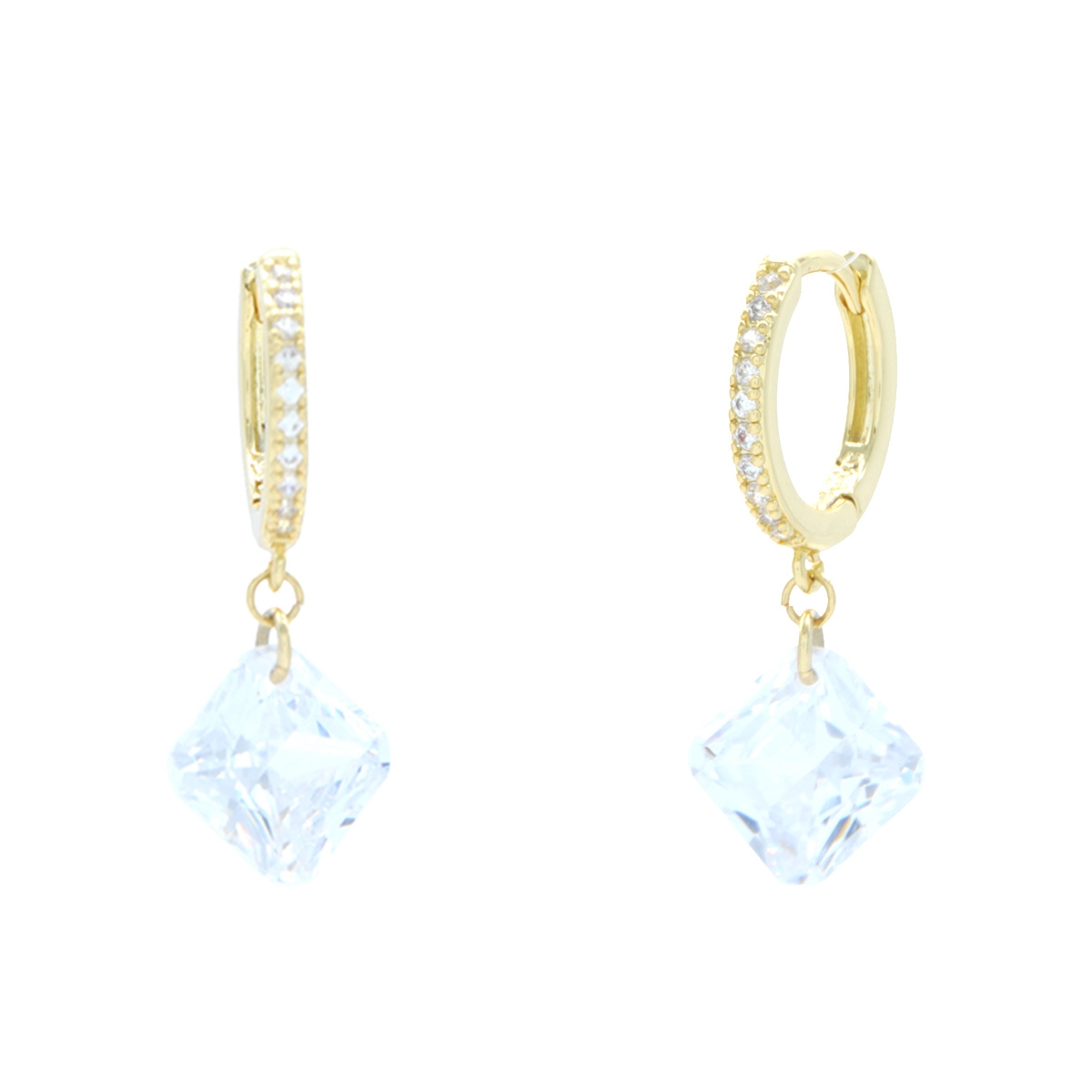 Our elegant "Sparkle and Go!" earrings flaunt a trendy huggie hoop design studded with clear AAA cubic zirconia and a contemporary diamond-shaped drop to give you that perfect extra dash of sparkle. Sterling silver posts. Nickel and lead free jewellery.