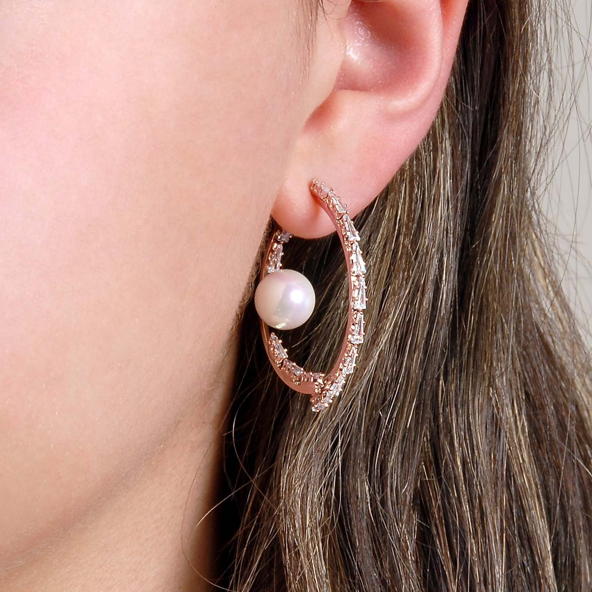 Our "Twisted Glam" earrings are the prettiest pearl earrings! Showcasing sparkling baguette style AAA cubic zirconia cascading down the front and back of this stunning design adorned with a radiant pearl to achieve pure style perfection! Sterling silver posts. Nickel and lead free jewellery.