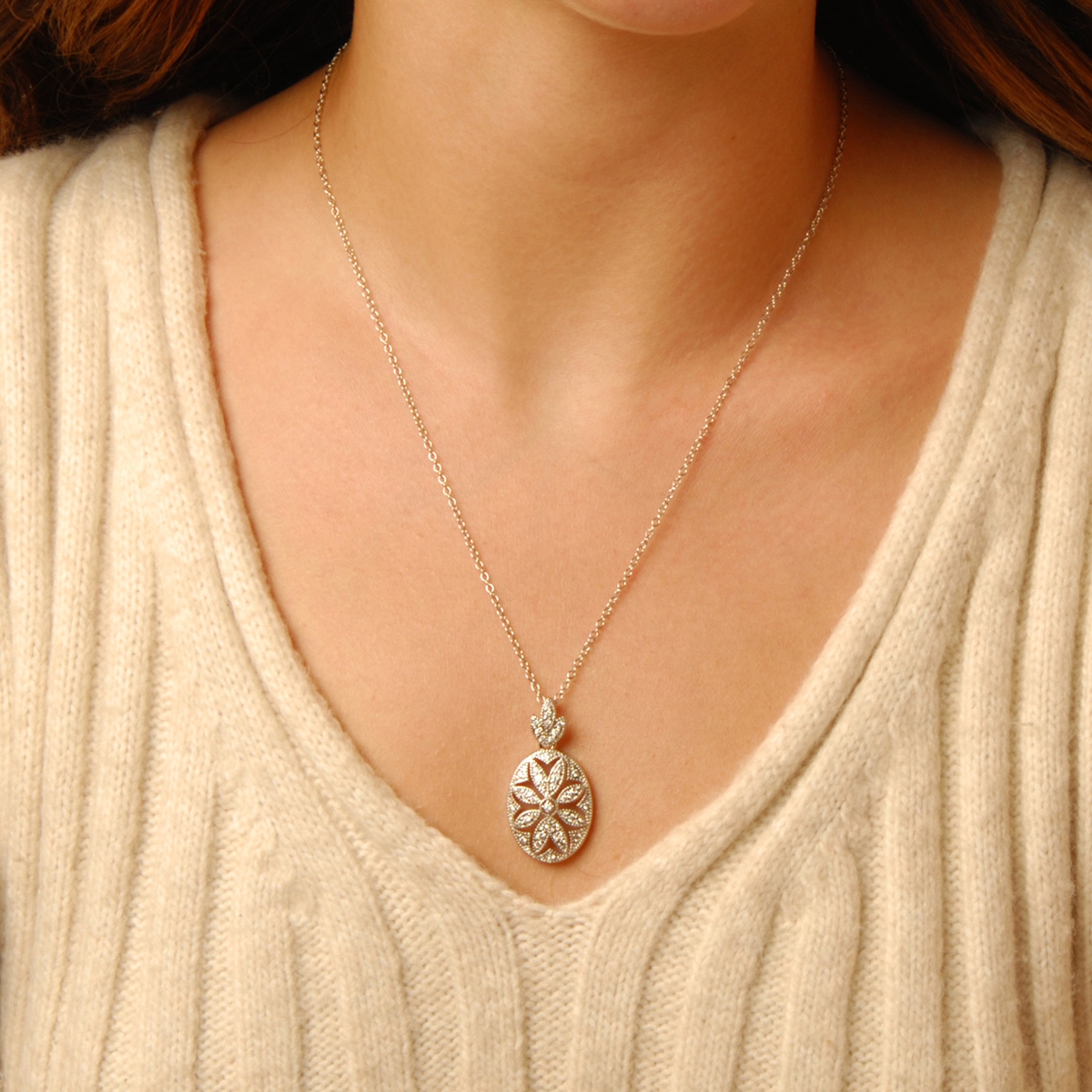 Botanically inspired, our romantic "Vintage Florals" neckpiece is elegantly designed showcasing a beautiful AAA cubic zirconia studded pendant on a sleek 18" designer chain. Nickel and lead free jewellery.