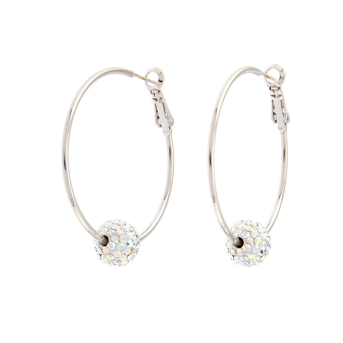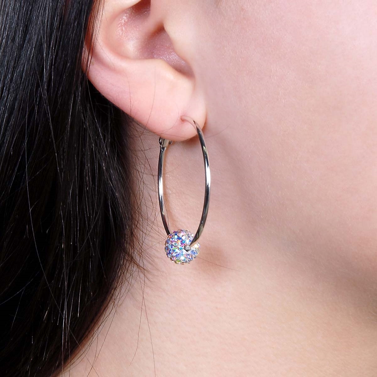 A timeless sleek hoop design, our "Vivid Aura" earrings are finished with the perfect touch of elegance adorned with a brilliant Swarovski crystal studded ball. Sterling silver posts. Nickel and lead free jewellery.