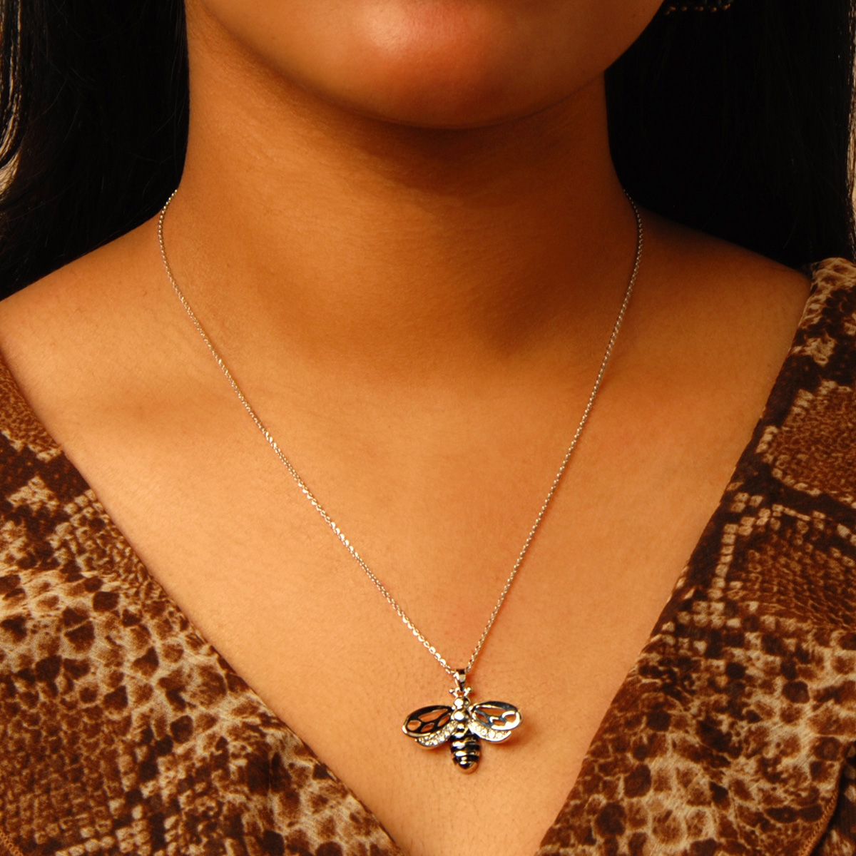 Our "Whimsical Bee" pendant is light-hearted and ready for any adventure! The charm of nature is abundant in this beautifully detailed design featuring sparkling clear Swawrovski crystal and hand-painted black enamel. 18" neckpiece with 2" extension. Nickel and lead free jewellery.