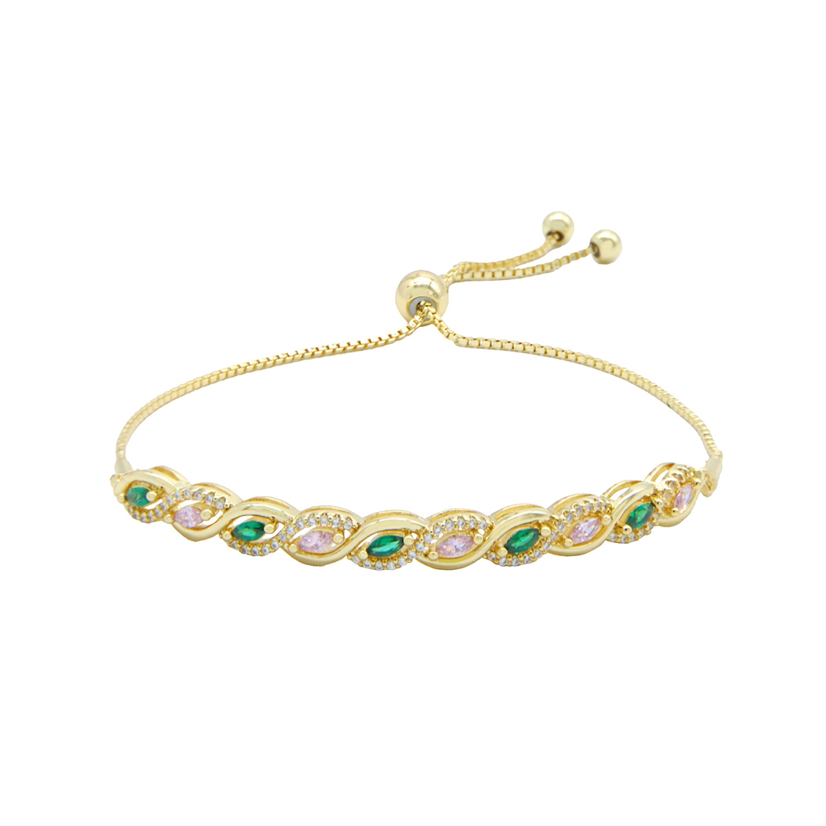 Rich and bold our "Woven Bliss" bracelet showcases an exquisite row of beautifully colored rose and emerald AAA cubic zirconia entwined with shimmering clears suspended from a sleek designer chain with easy-to-wear, adjustable drawstring closure. Nickel and lead free jewellery.